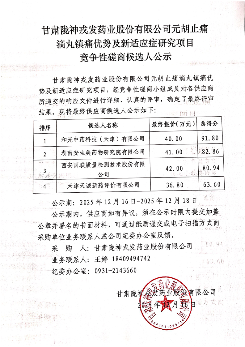 甘肃陇神戎发药业股份有限公司元胡止痛滴丸镇痛优势及新适应症研究项目竞争性磋商候选人公示