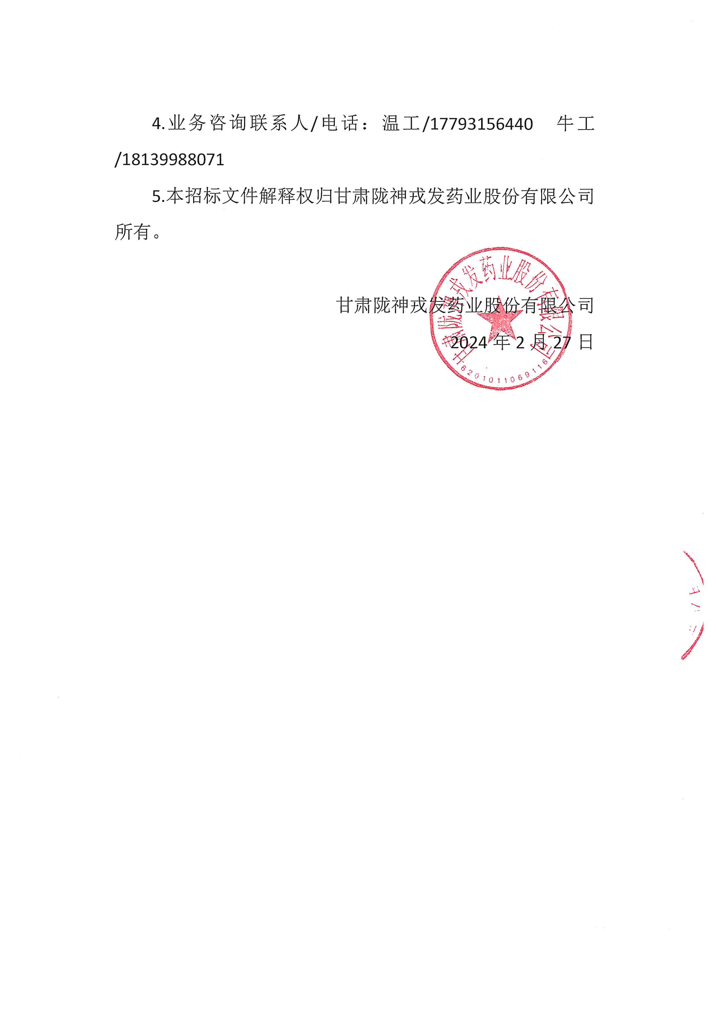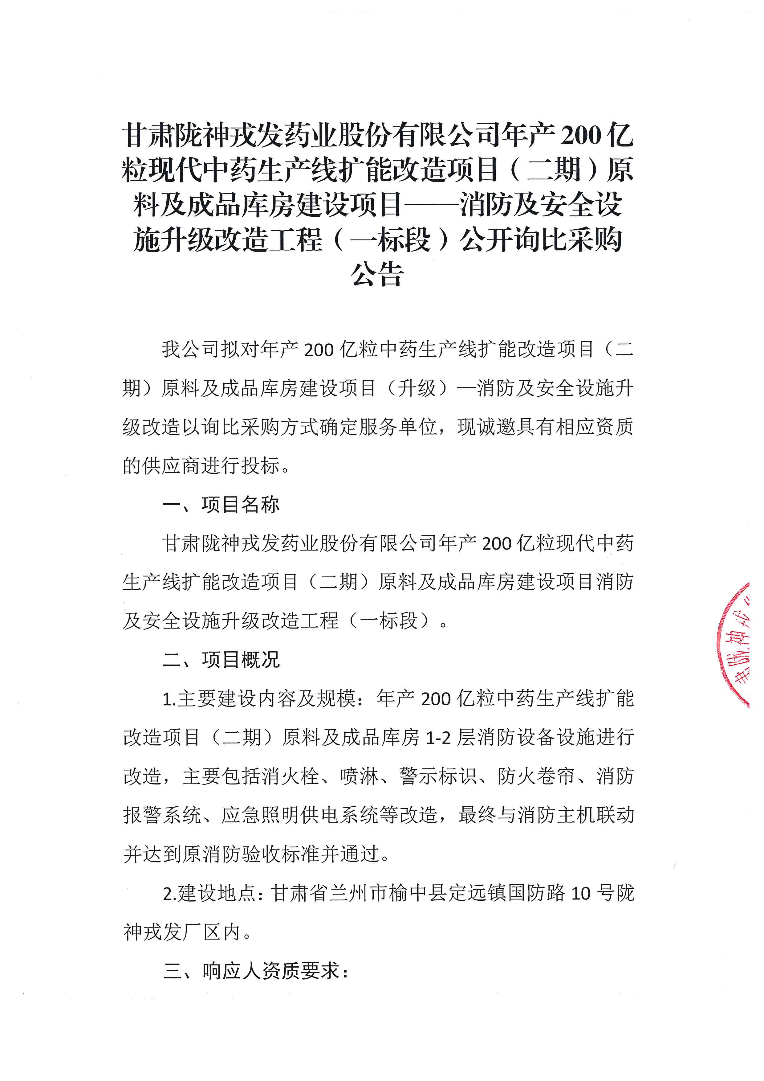 甘肃陇神戎发药业股份有限公司年产200亿粒现代中药生产线扩能改造项目(二期)原料及成品库房建设项目——消防及安全设施升级改造工程(一标段)公开询比采购公告