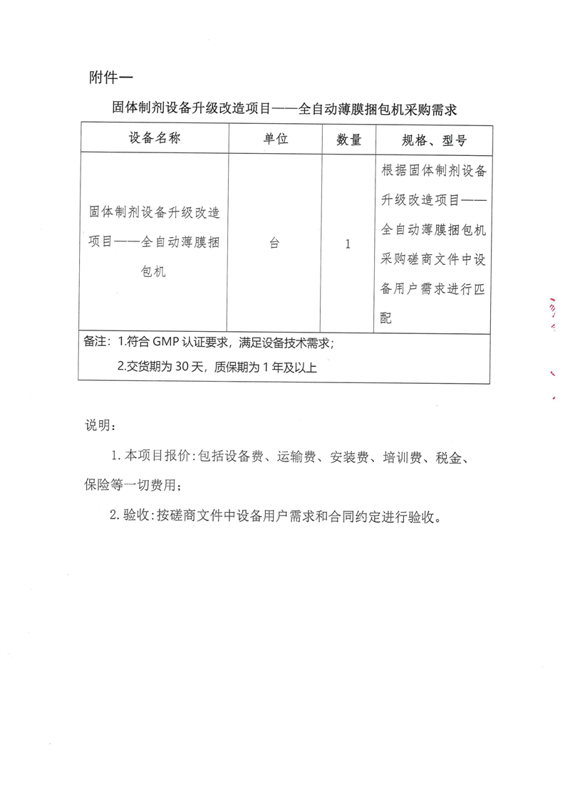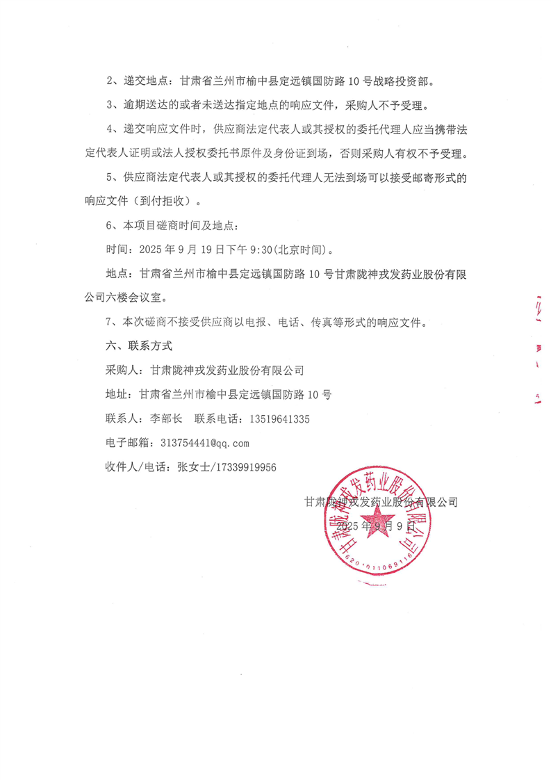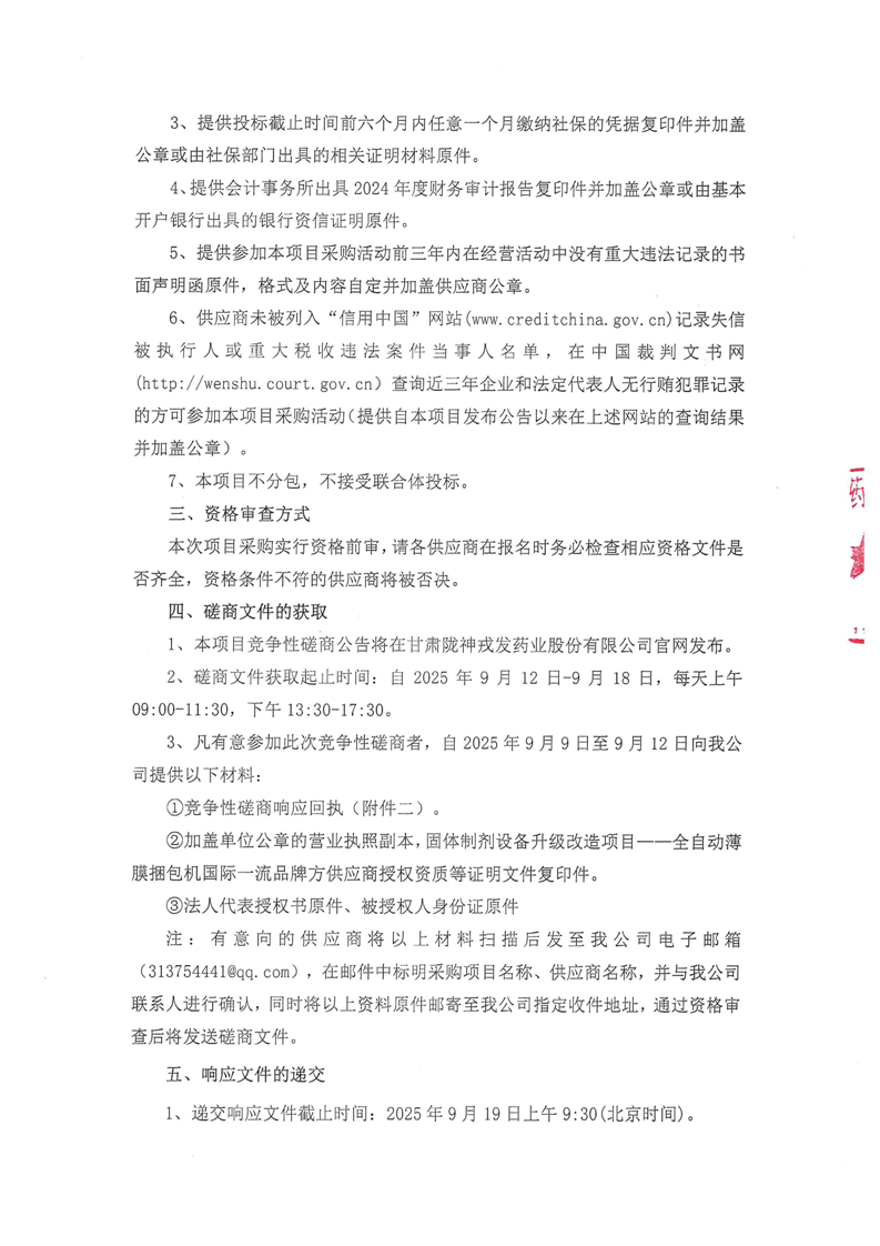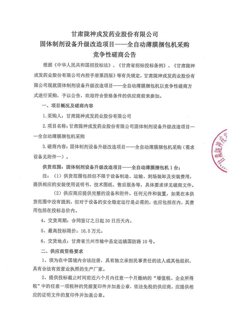 甘肃陇神戎发药业股份有限公司固体制剂设备升级改造项目--全自动薄膜捆包机采购竞争性磋商公告