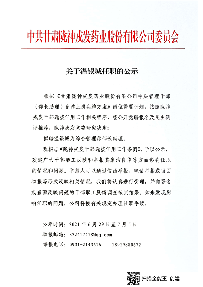 关于温银城任职的公示
