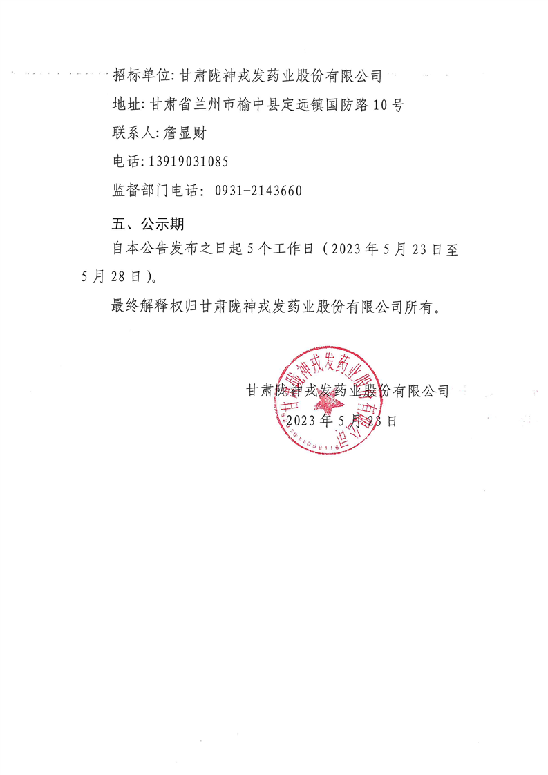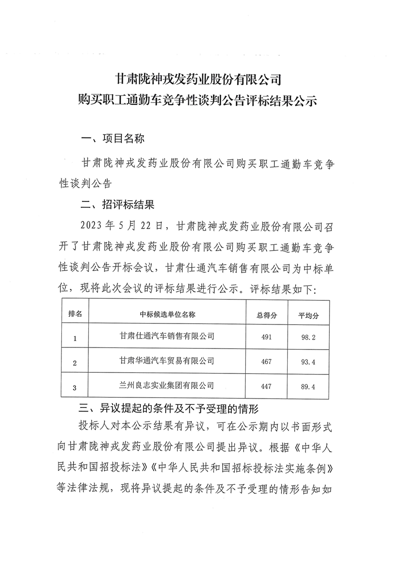 甘肃陇神戎发药业股份有限公司购买职工通勤车竞争性谈判公告评标结果公示