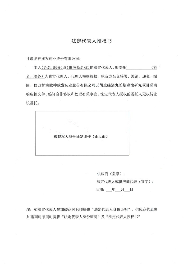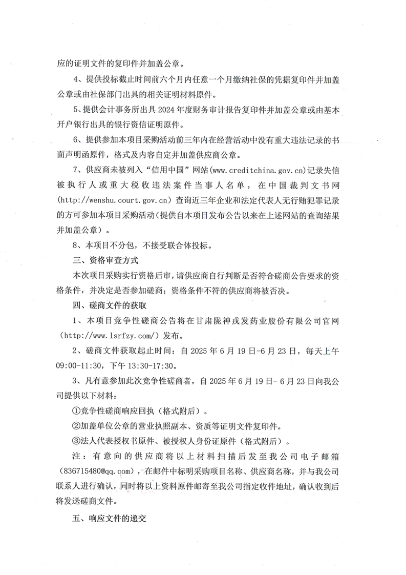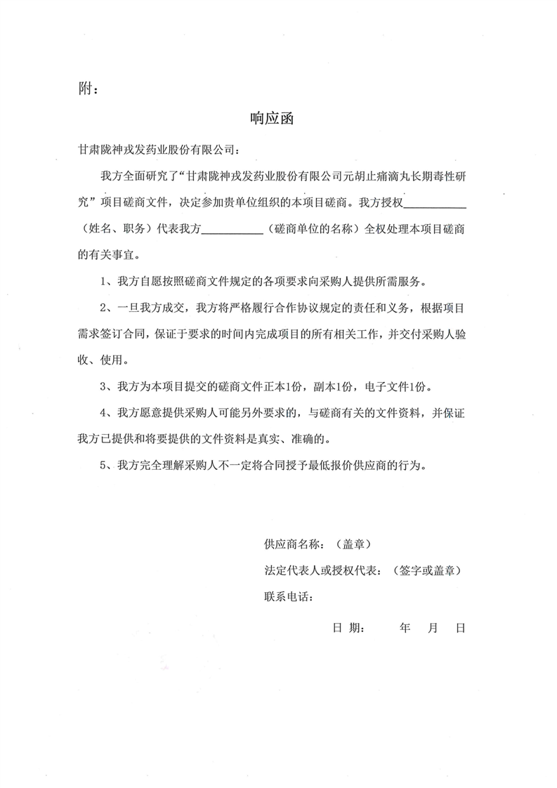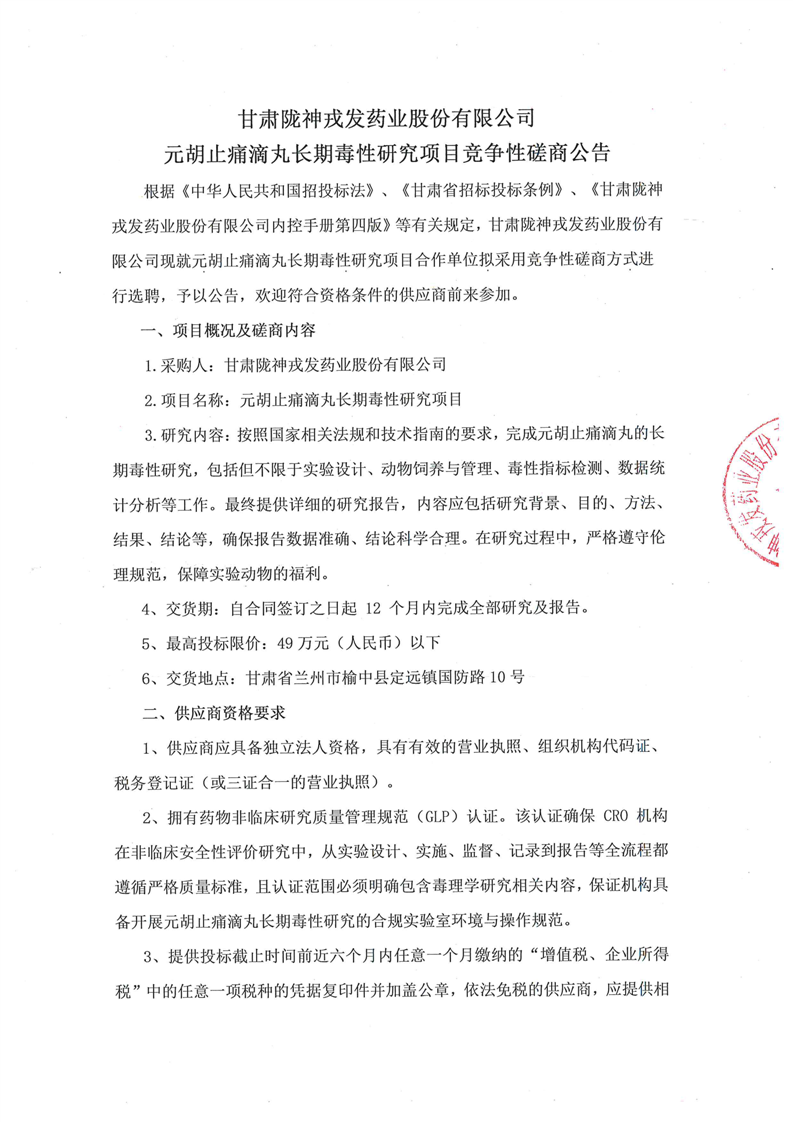 甘肃陇神戎发药业股份有限公司元胡止痛滴丸长期毒性研究项目竞争性磋商公告