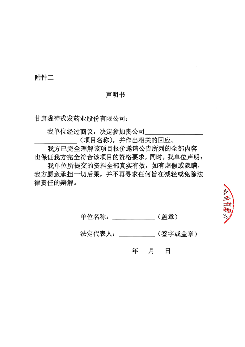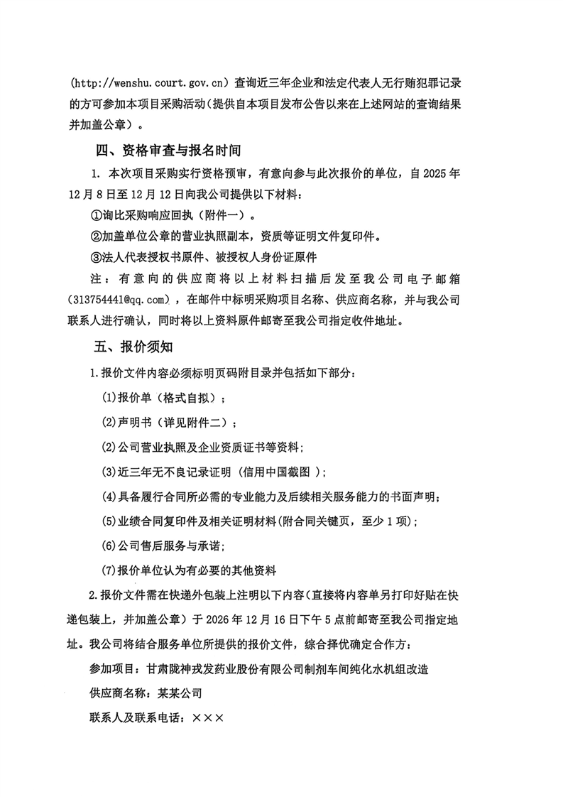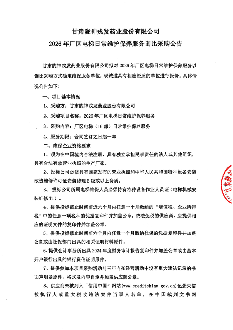 甘肃陇神戎发药业股份有限公司2026年厂区电梯日常维护保养服务询比采购公告