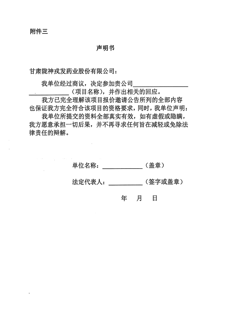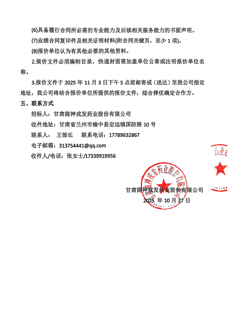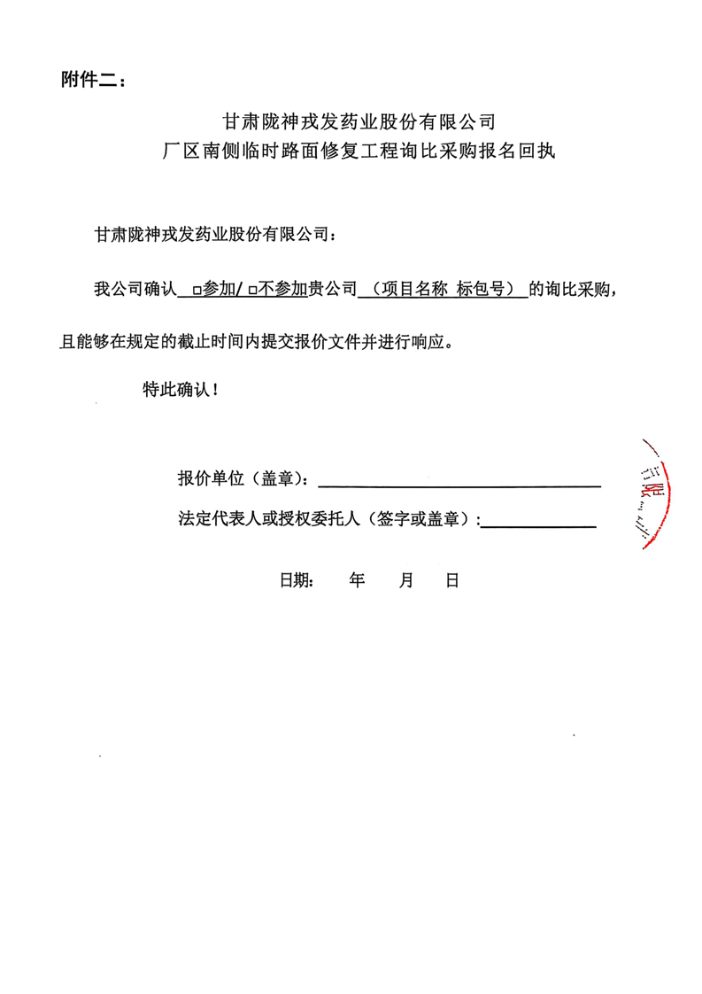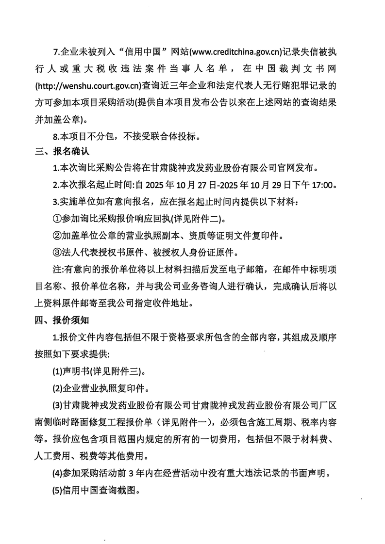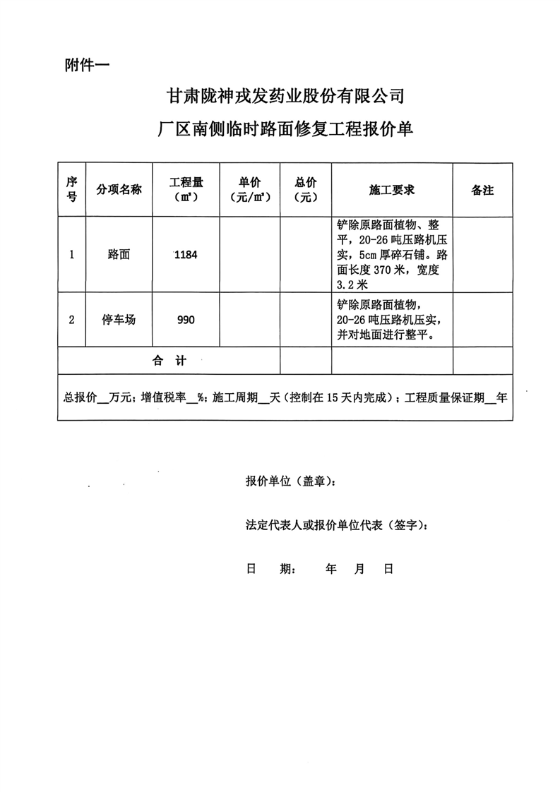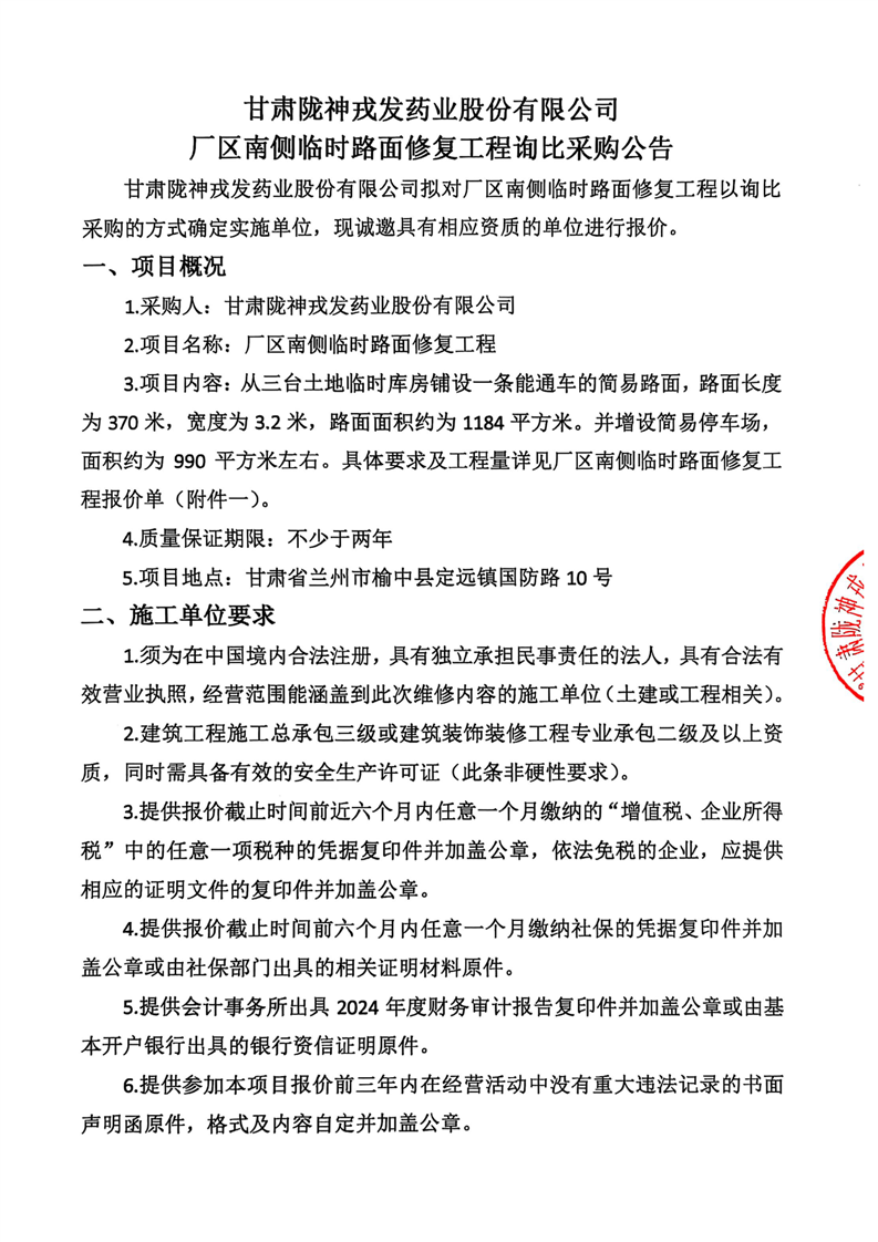 甘肃陇神戎发药业股份有限公司厂区南侧临时路面修复工程询比采购公告