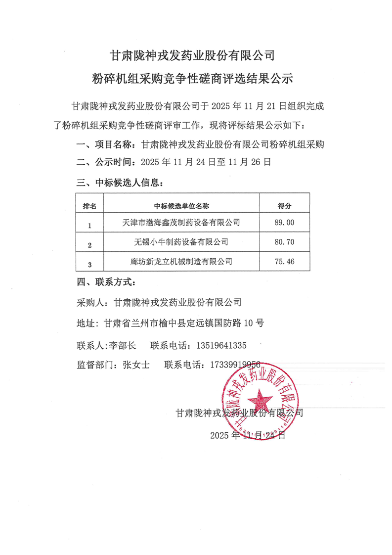 甘肃陇神戎发药业股份有限公司粉碎机组采购竞争性磋商评选结果公示