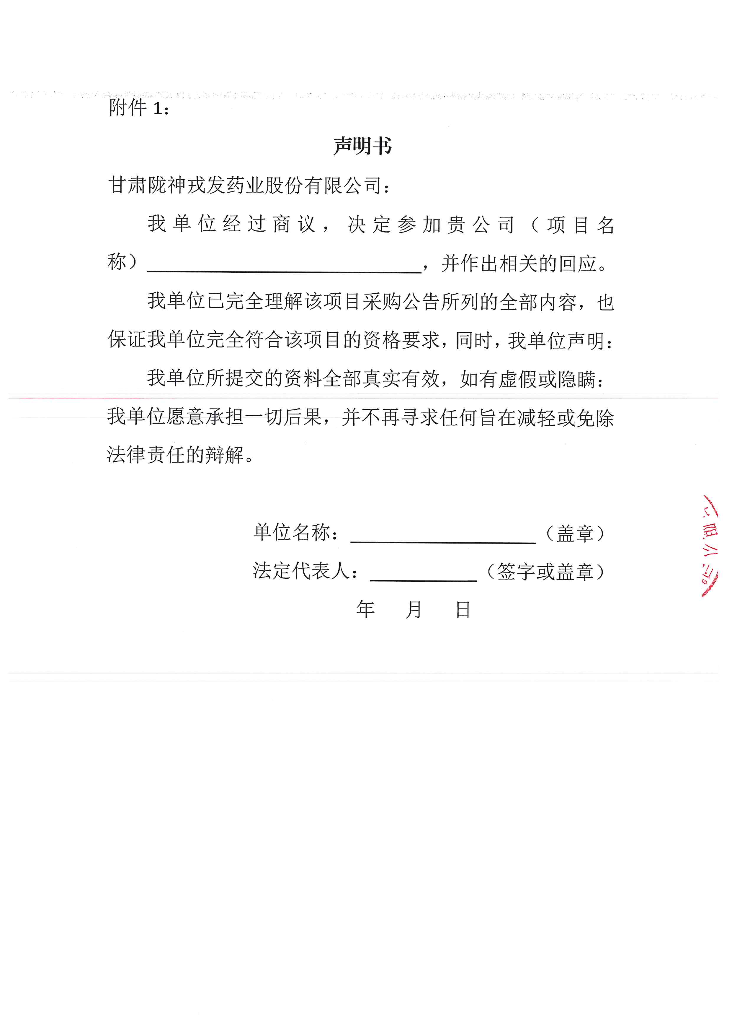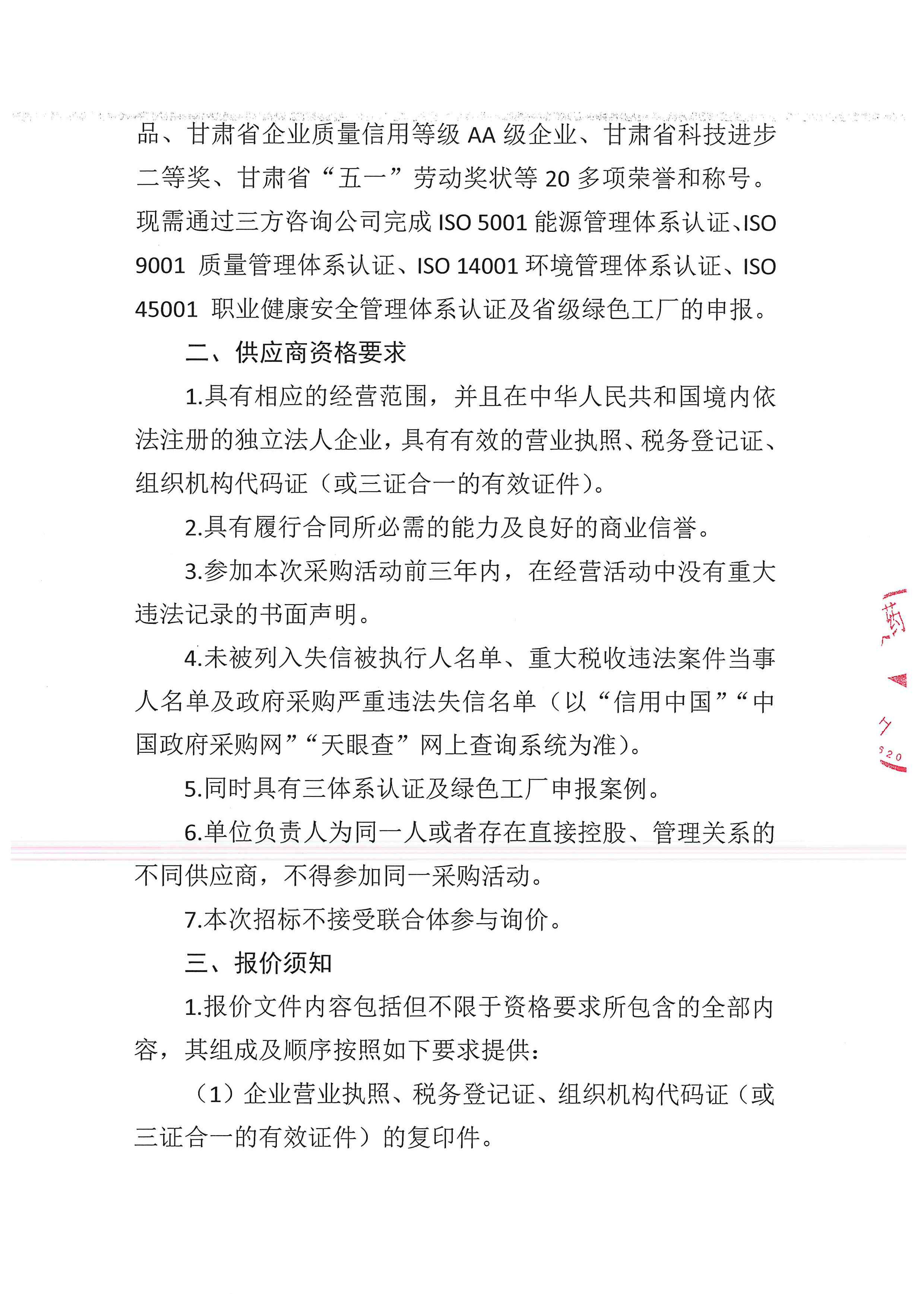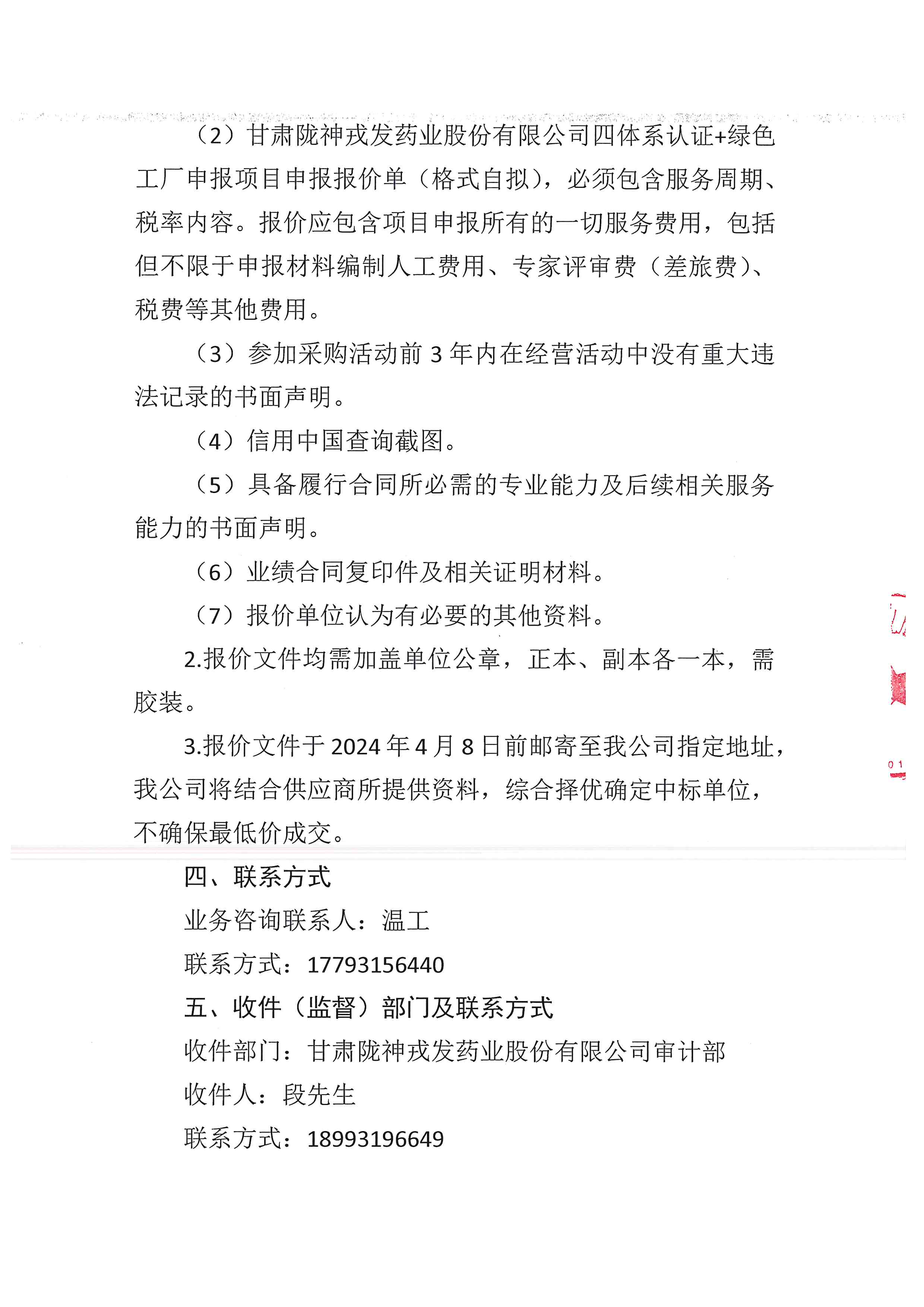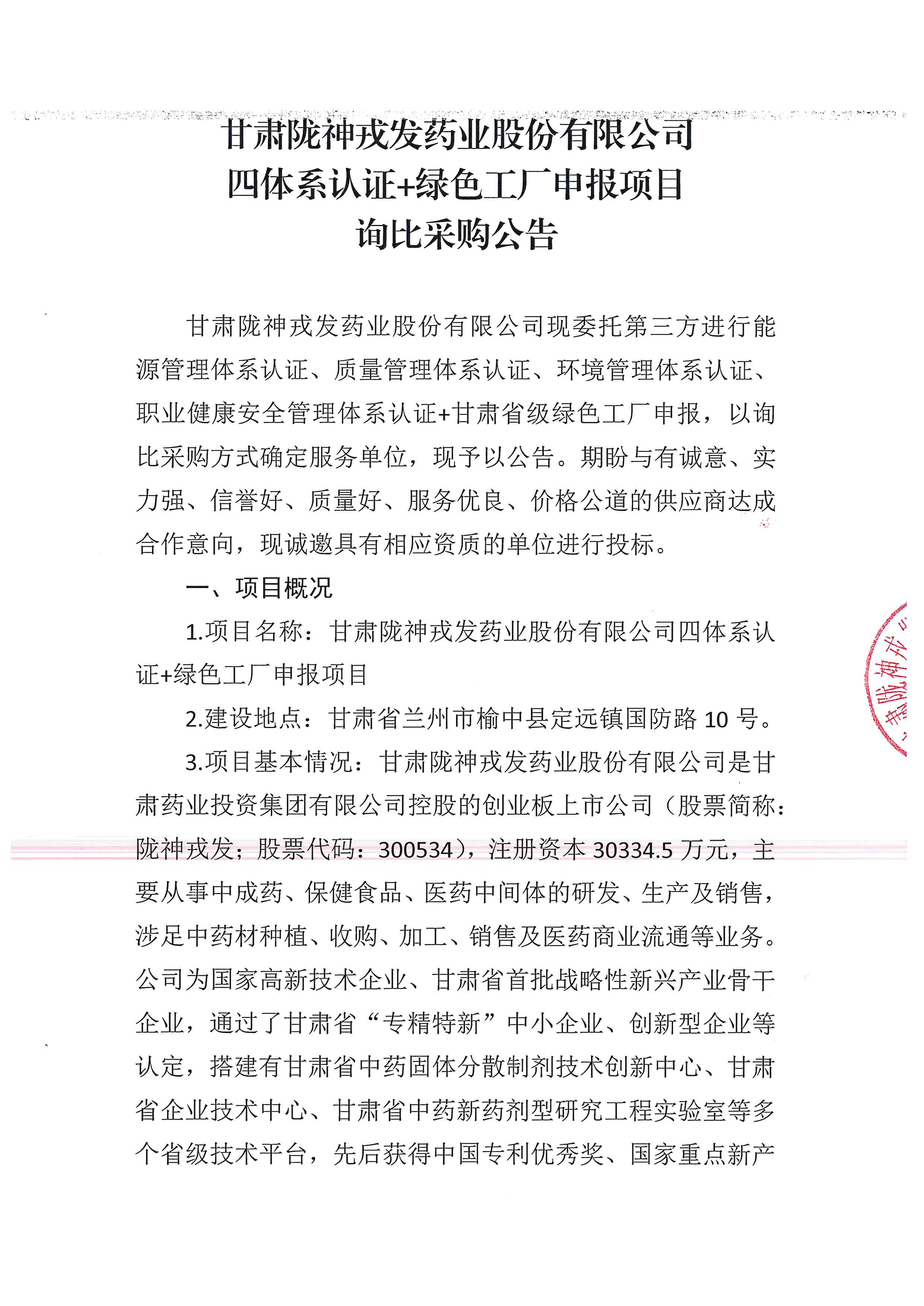 甘肃陇神戎发药业股份有限公司四体系认证+绿色工厂申报项目询比采购公告