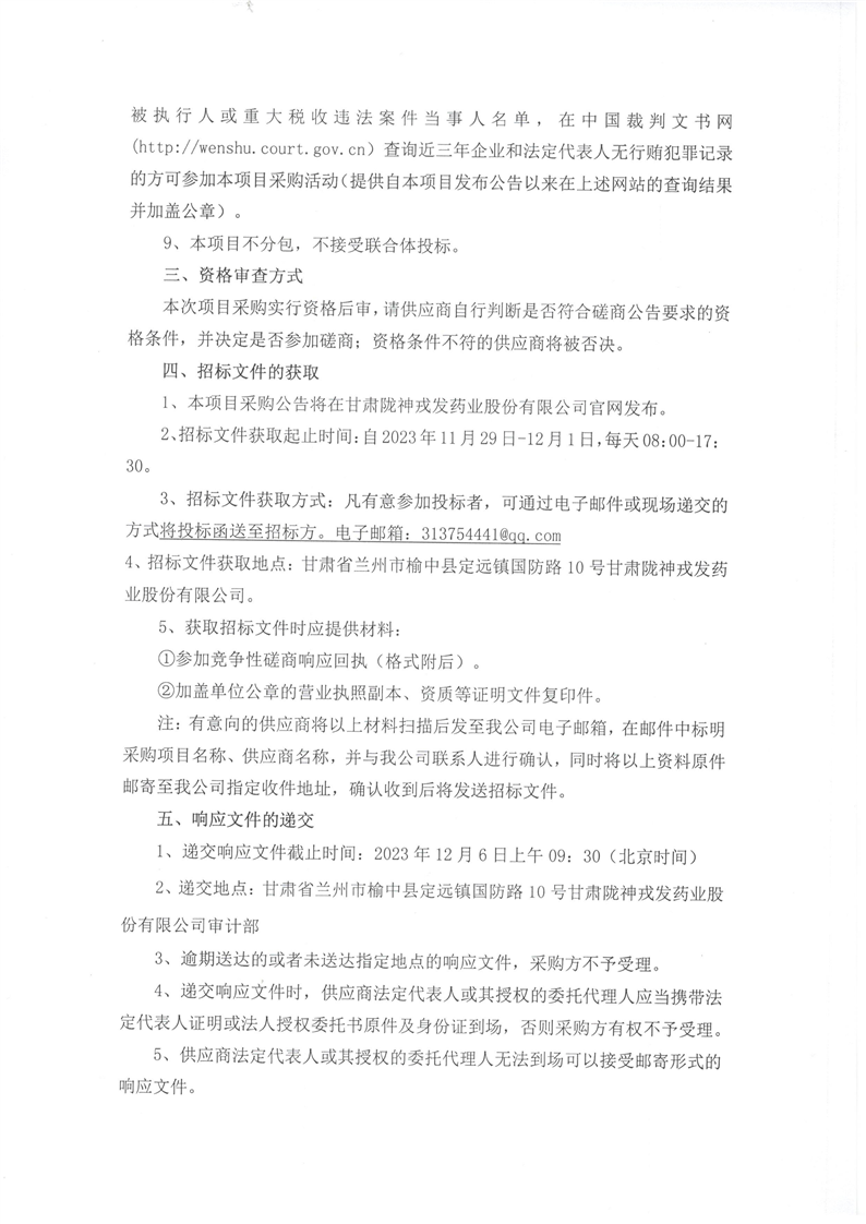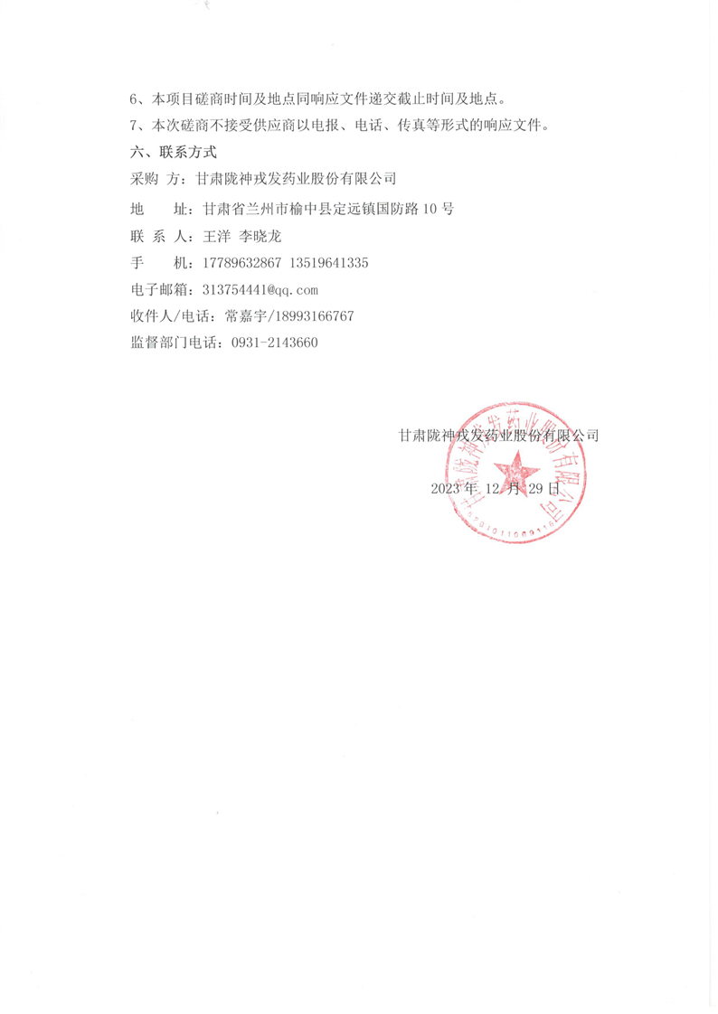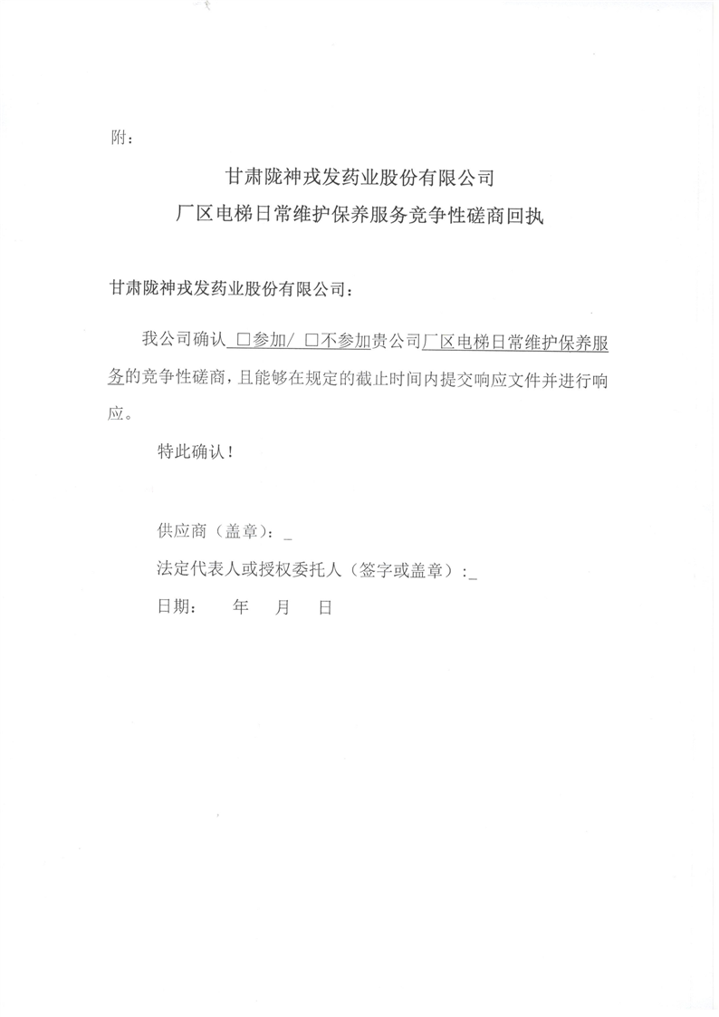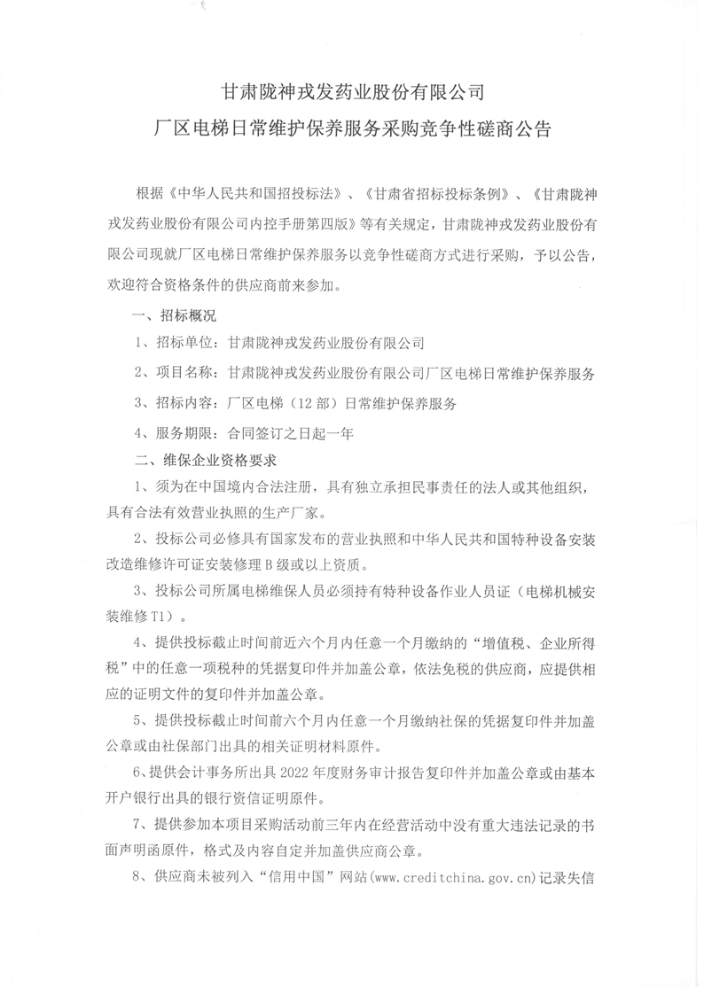 甘肃陇神戎发药业股份有限公司厂区电梯日常维护保养服务采购竞争性磋商公告