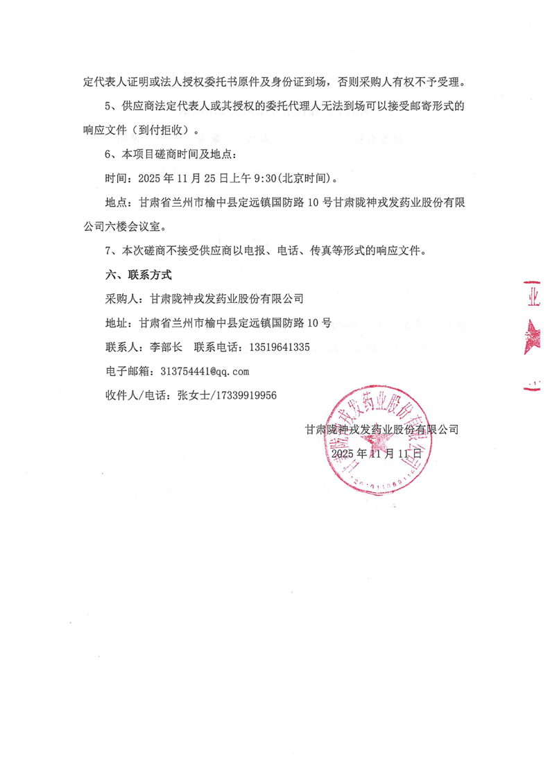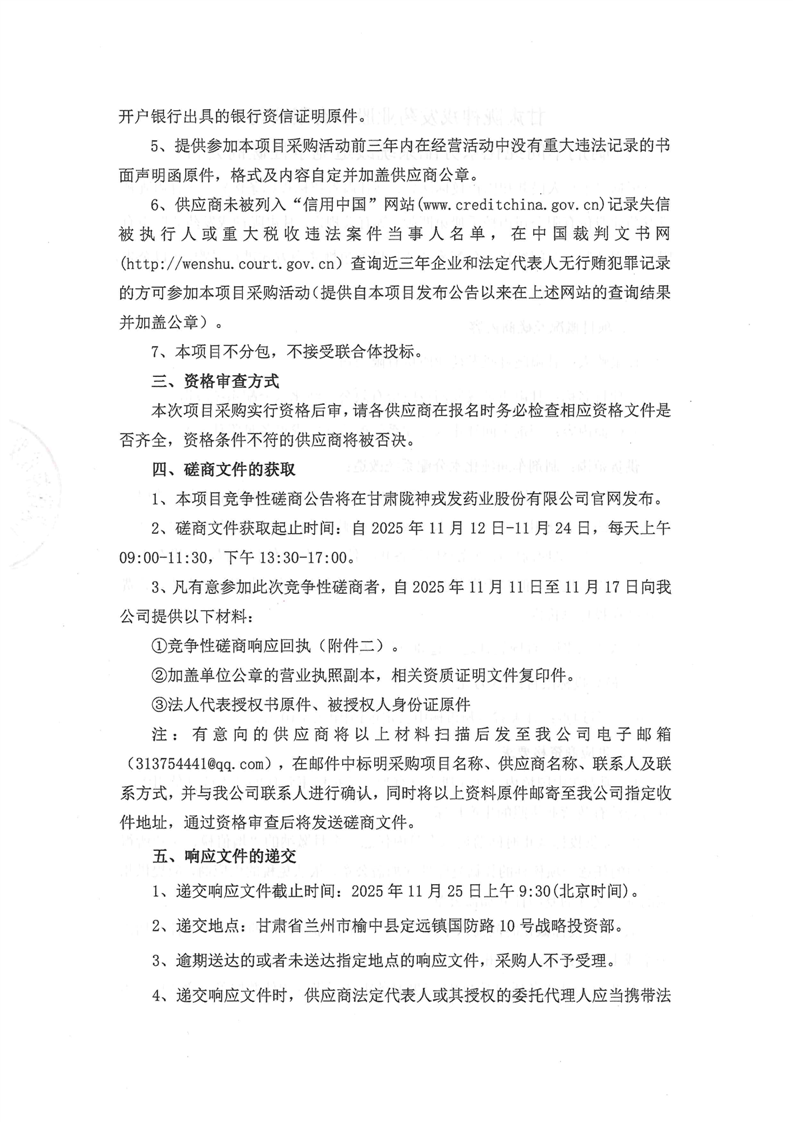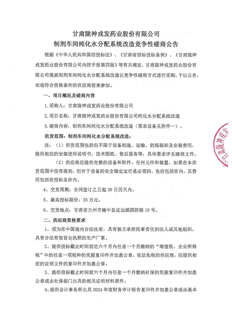 甘肃陇神戎发药业股份有限公司制剂车间纯化水分配系统改造竞争性磋商公告
