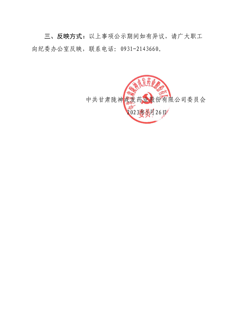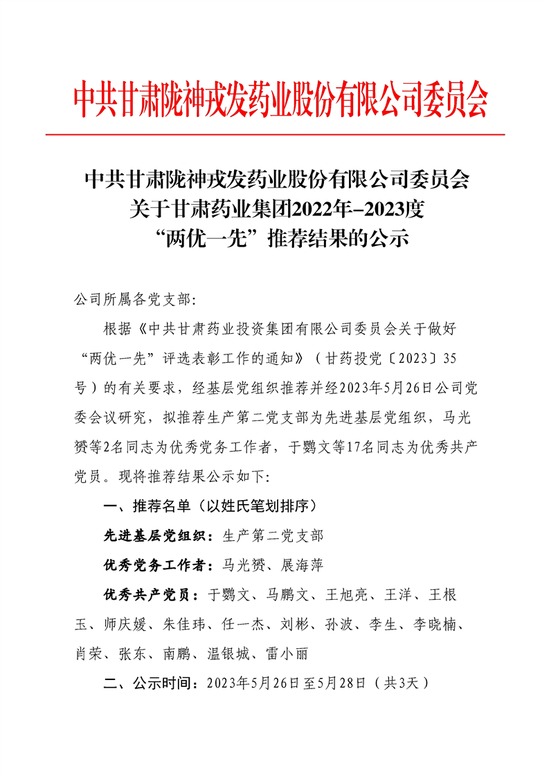 中共甘肃陇神戎发药业股份有限公司委员会关于甘肃药业集团2022年-2023度“两优一先”推荐结果的公示
