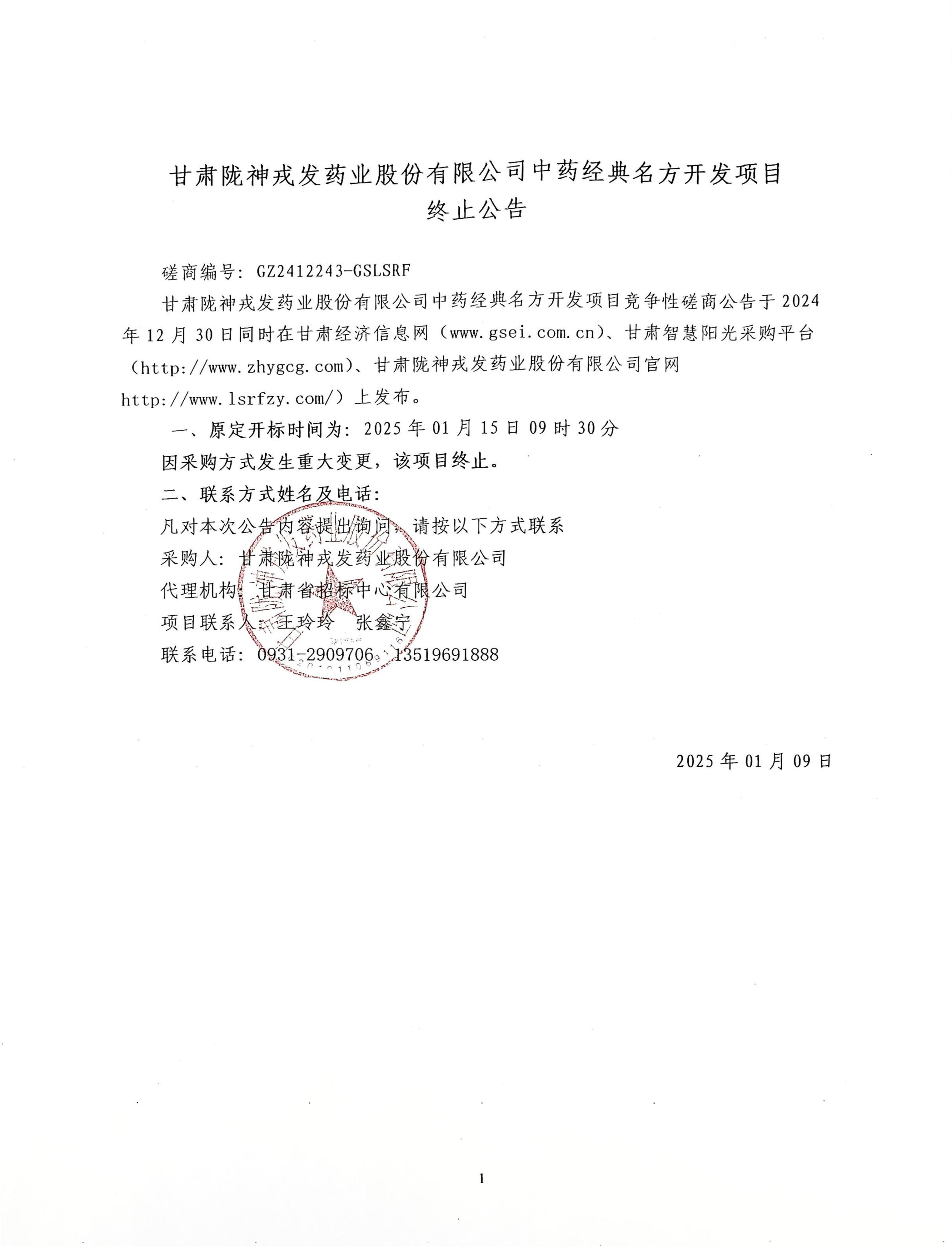 甘肃陇神戎发药业股份有限公司中药经典名方开发项目终止公告