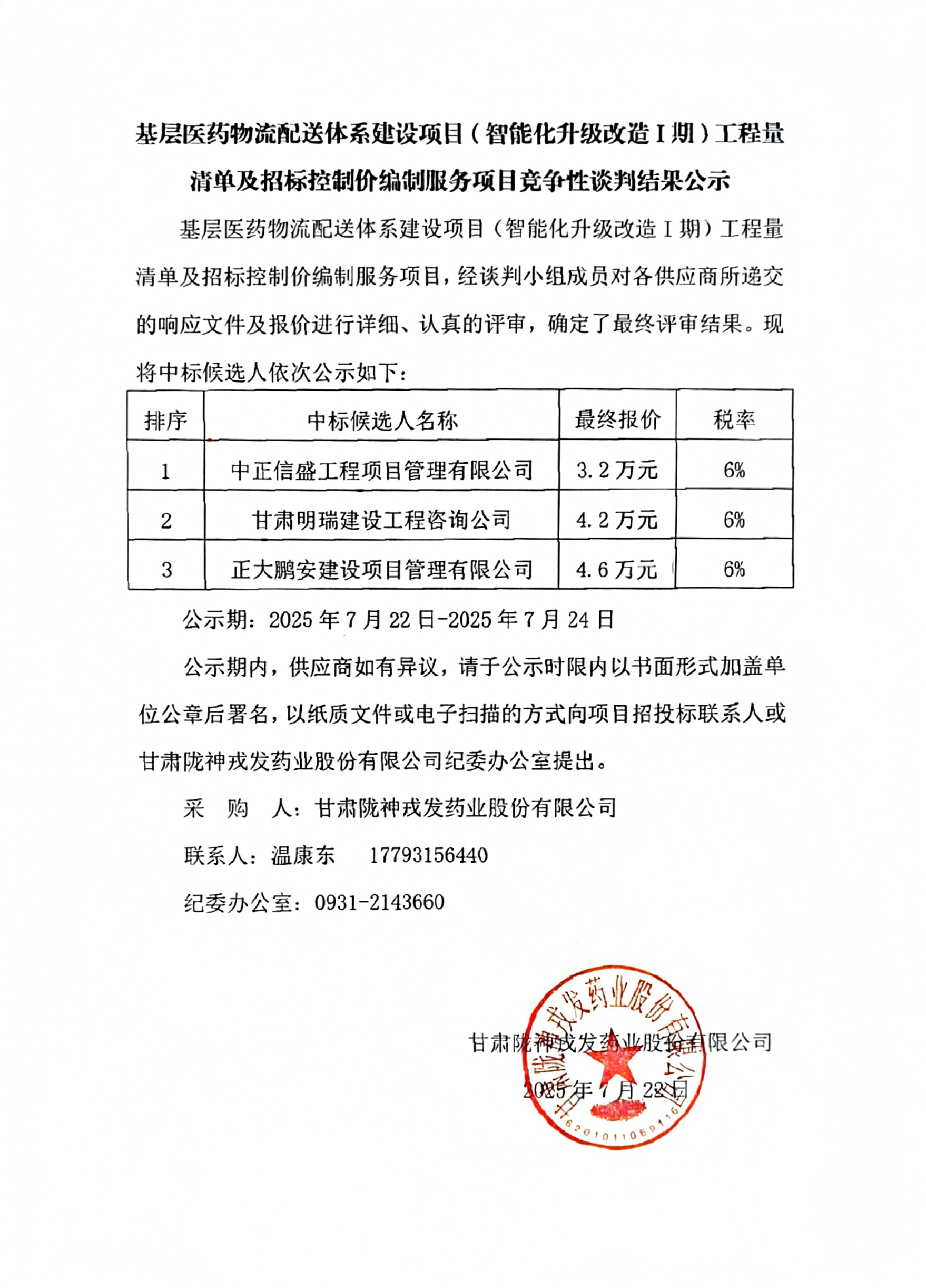 基层医药物流配送体系建设项目(智能化升级改造I期)工程量清单及招标控制价编制服务项目竞争性谈判结果公示