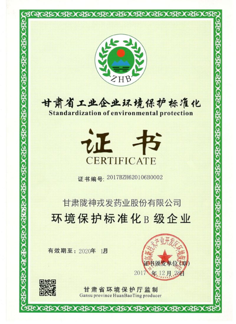 公示:公司荣获甘肃省工业企业环境保护标准化B级企业证书