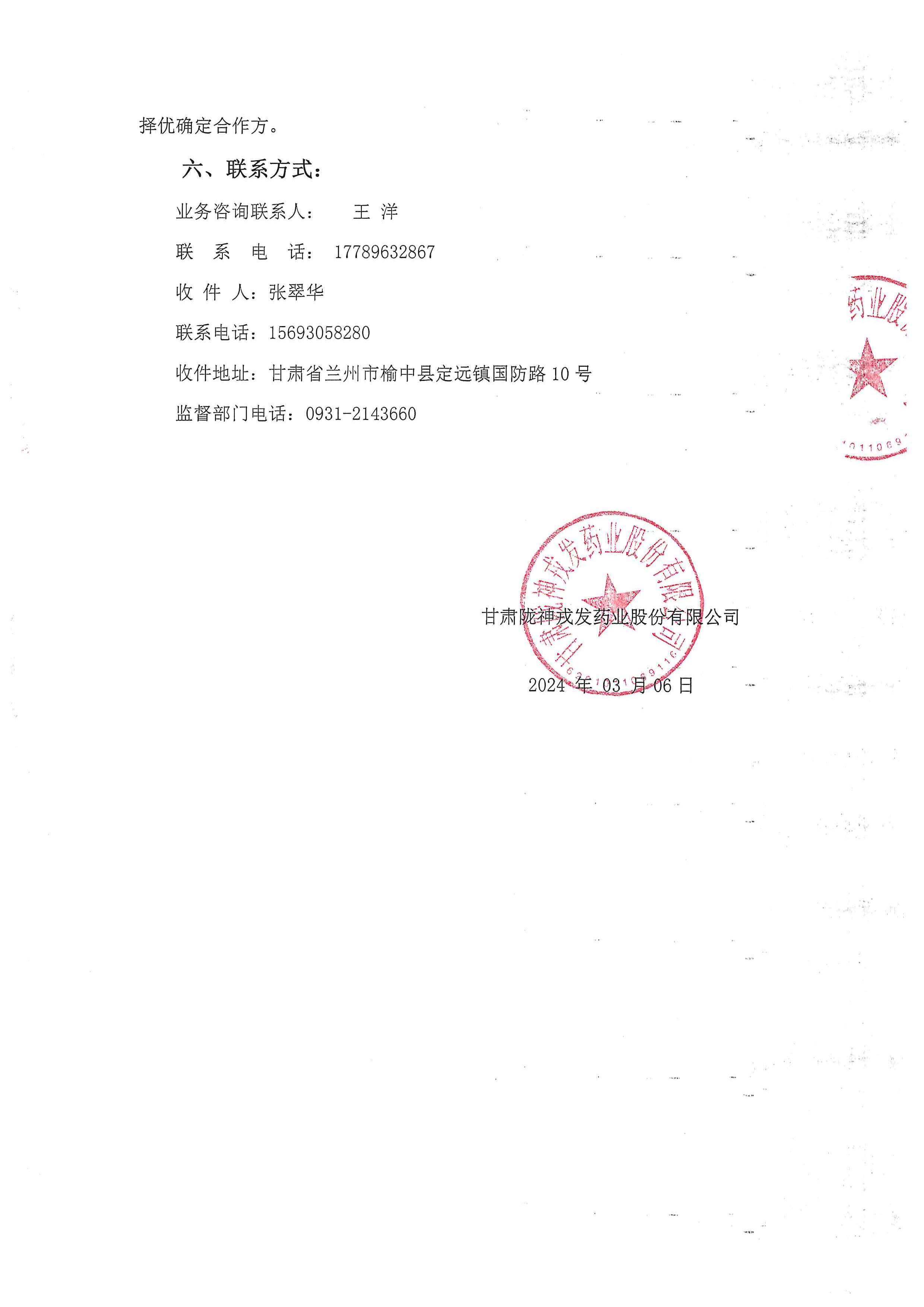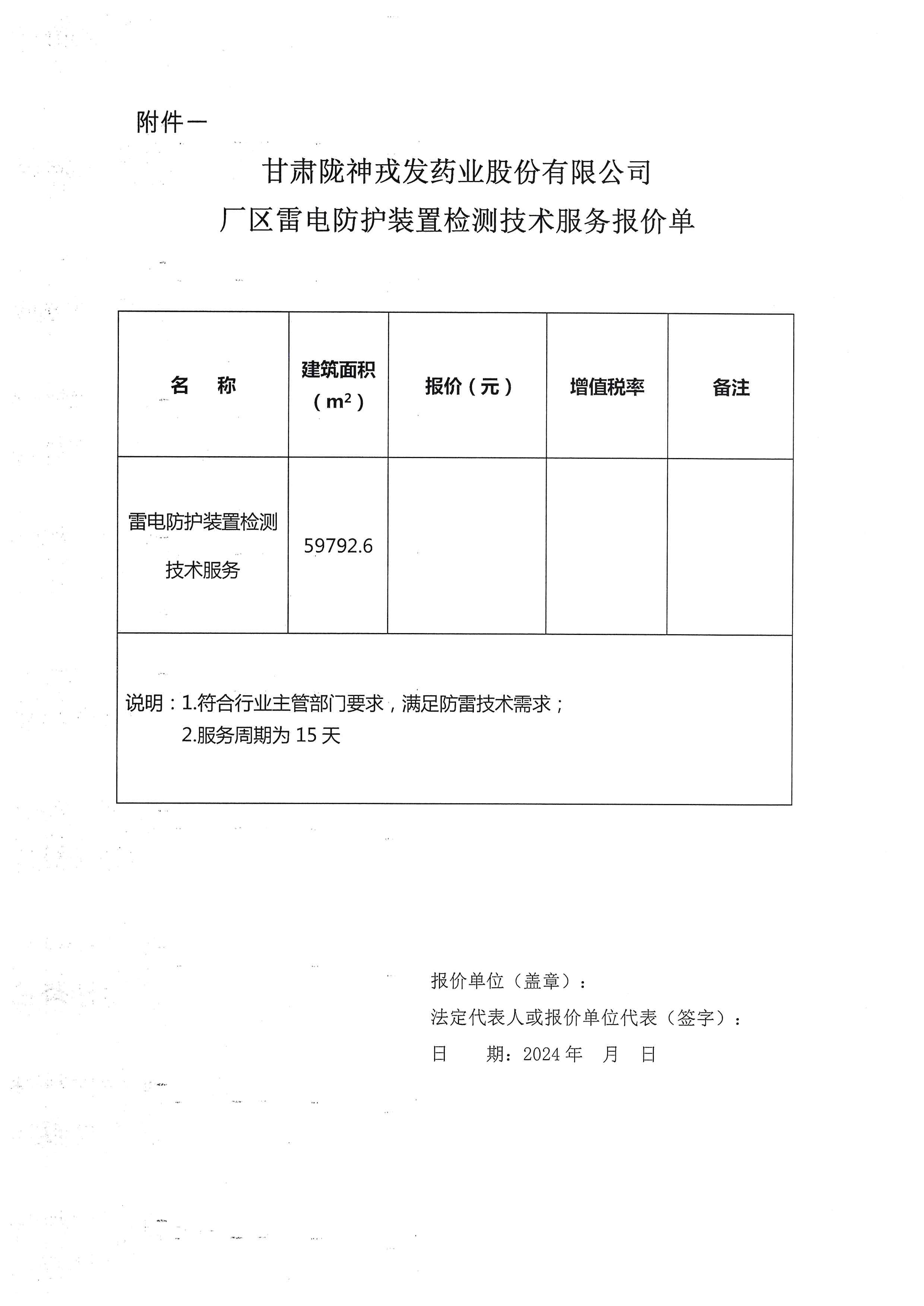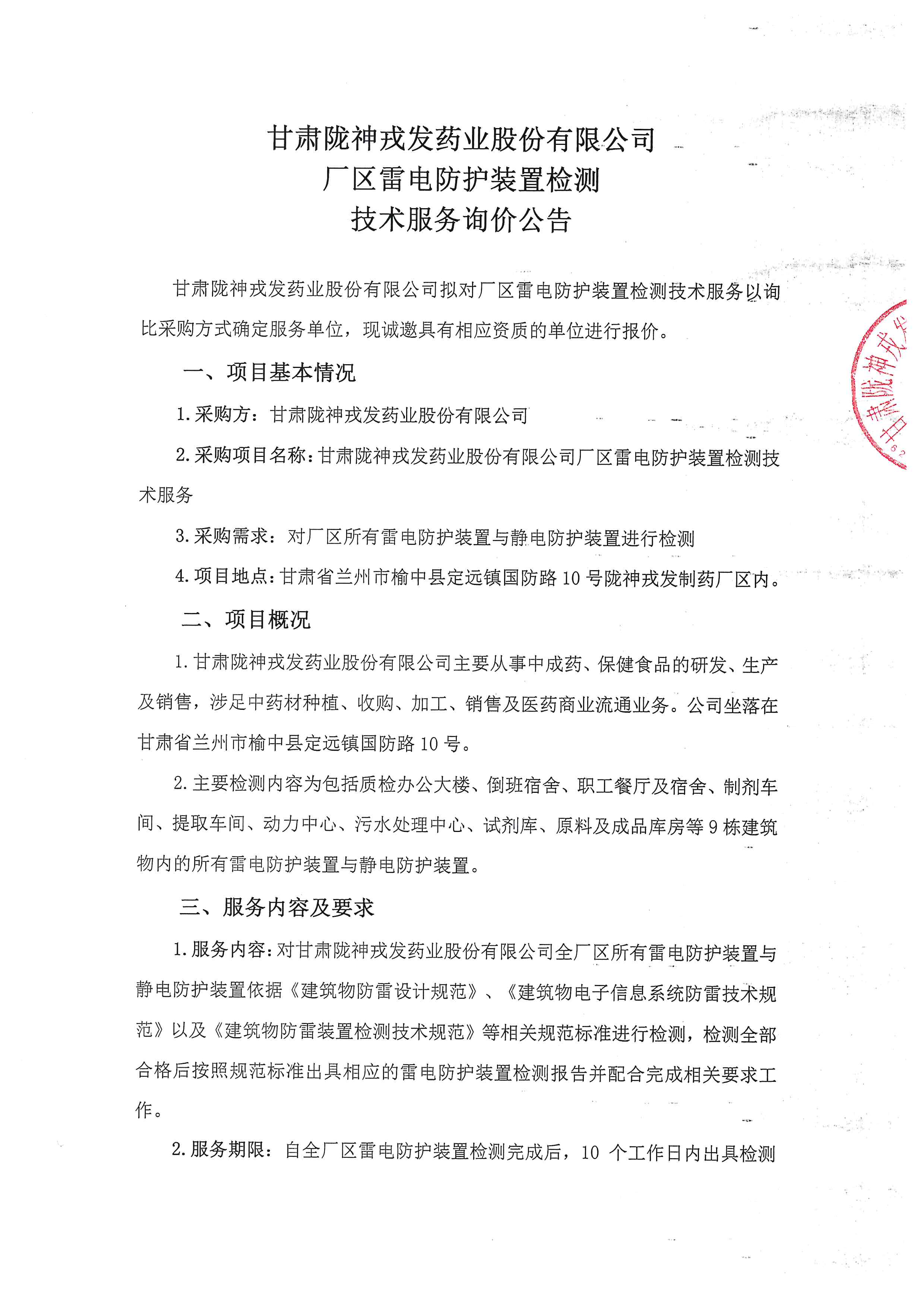 甘肃陇神戎发药业股份有限公司厂区雷电防护装置检测技术服务询价公告