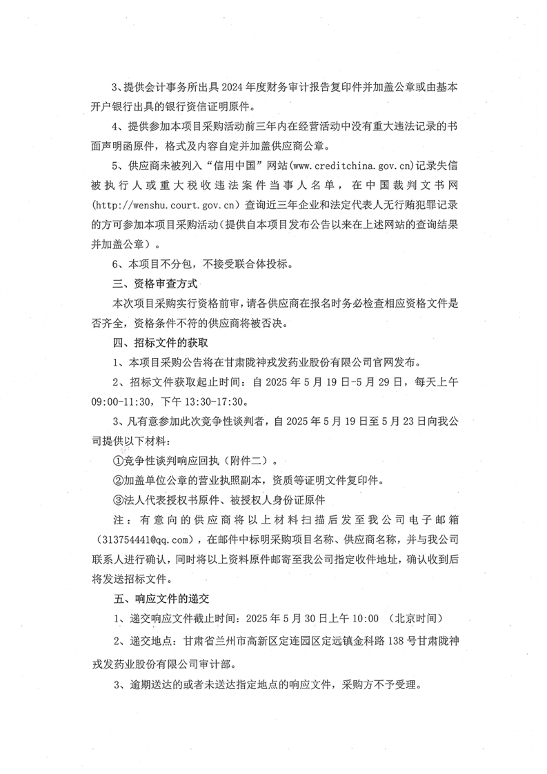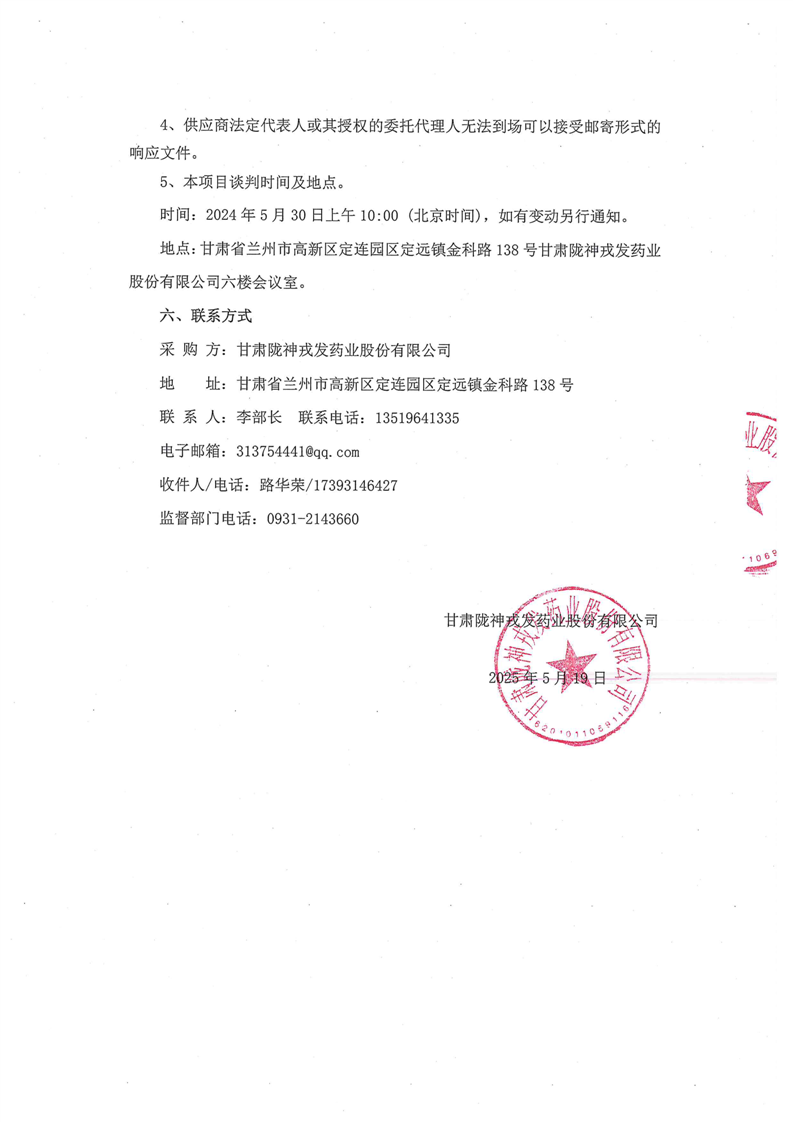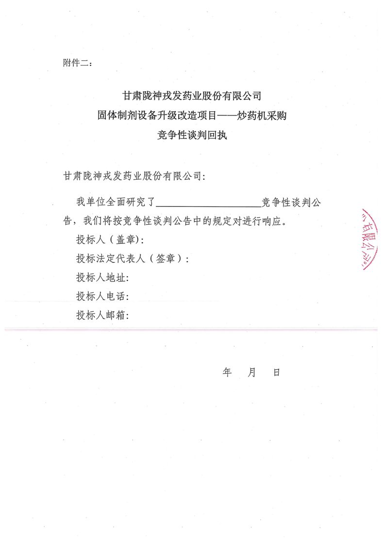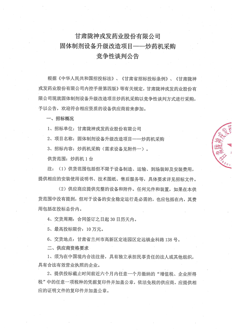 甘肃陇神戎发药业股份有限公司固体制剂设备升级改造项目——炒药机采购竞争性谈判公告