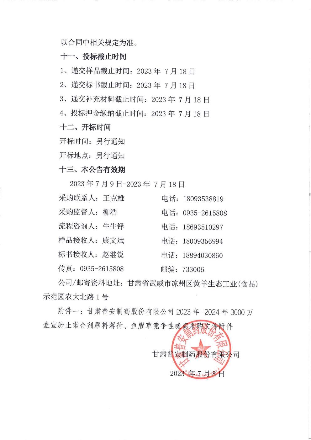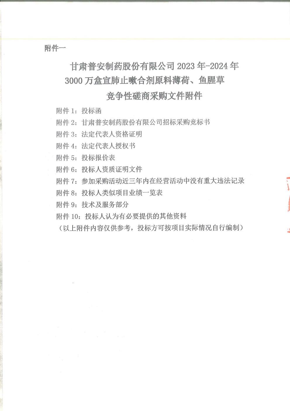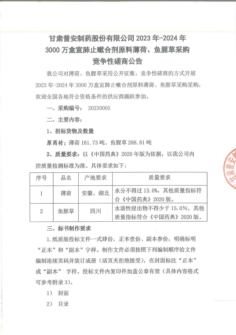 甘肃普安制药股份有限公司 2023 年-2024年3000 万盒宣肺止嗽合剂原料薄荷、鱼腥草采购竞争性磋商公告