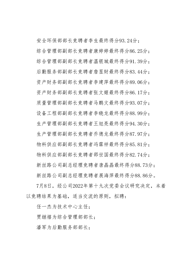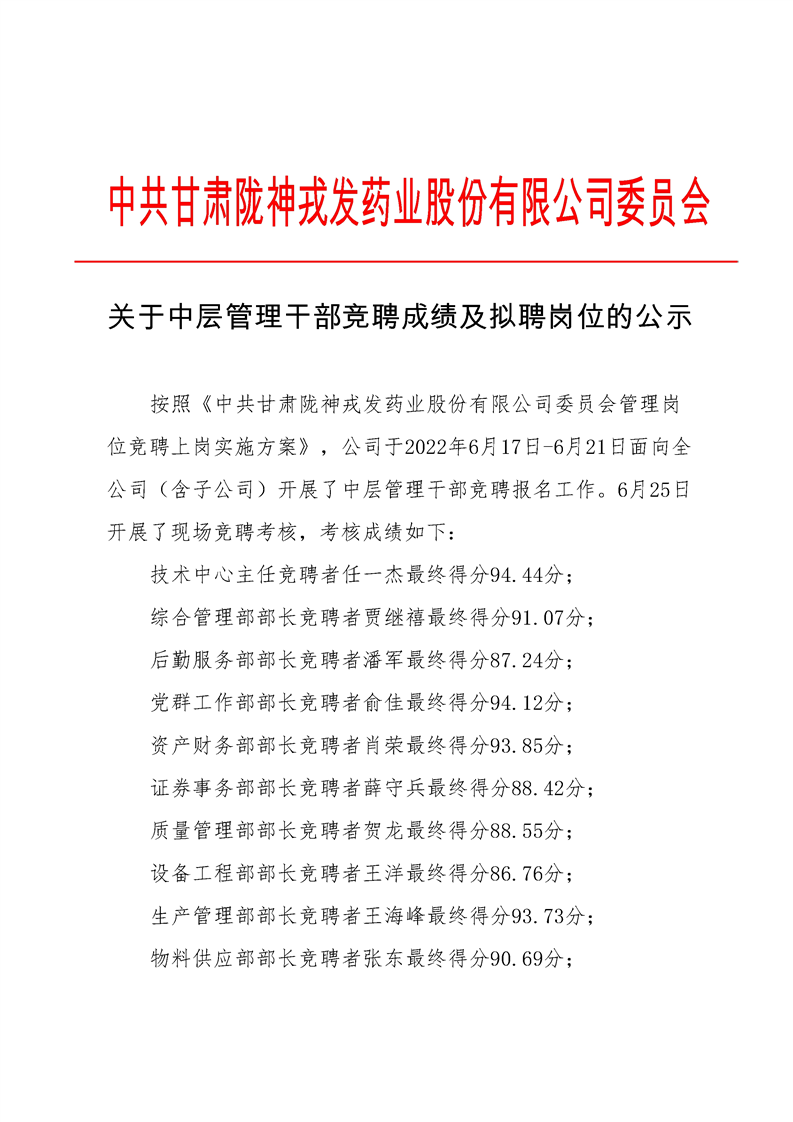 关于中层管理干部竞聘成绩及拟聘岗位的公示