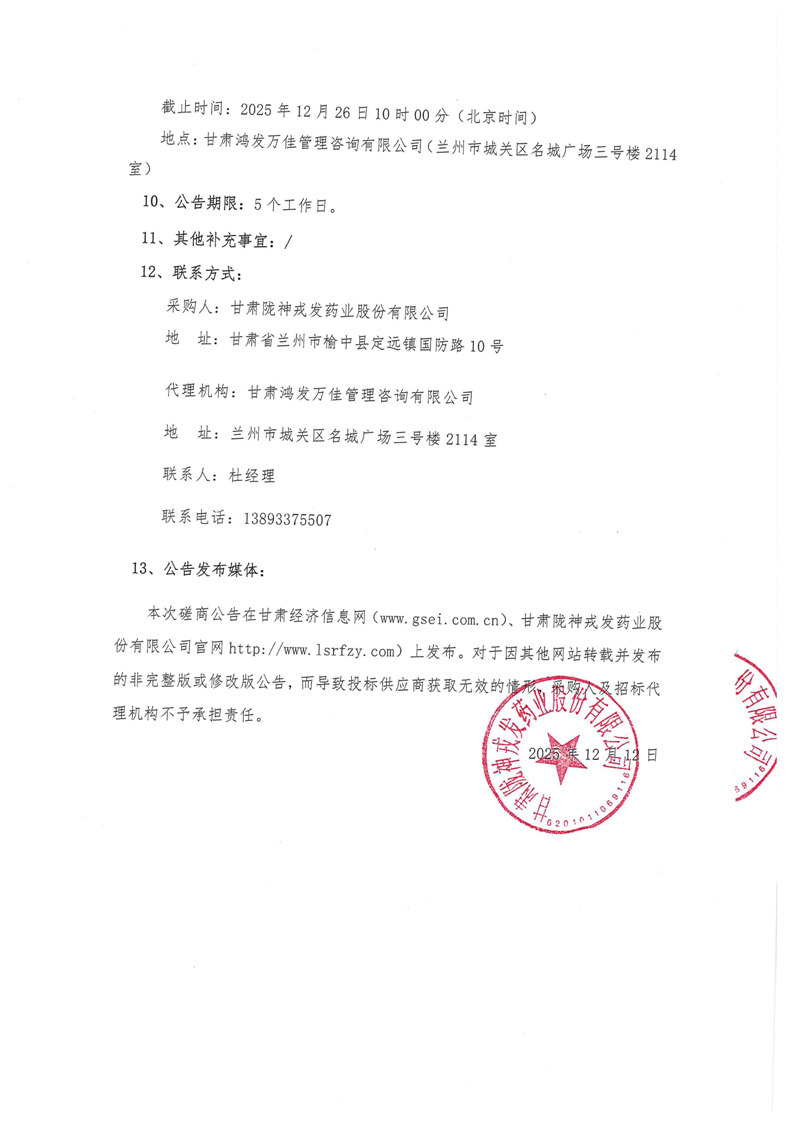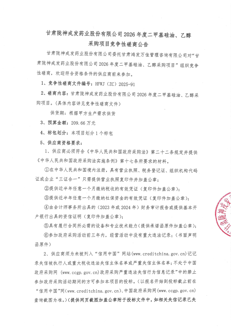 甘肃陇神戎发药业股份有限公司2026年度二甲基硅油、乙醇采购项目竞争性磋商公告