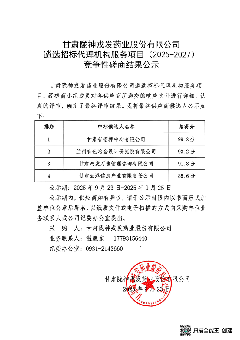 甘肃陇神戎发药业股份有限公司遴选招标代理机构服务项目(2025-2027)竞争性磋商结果公示