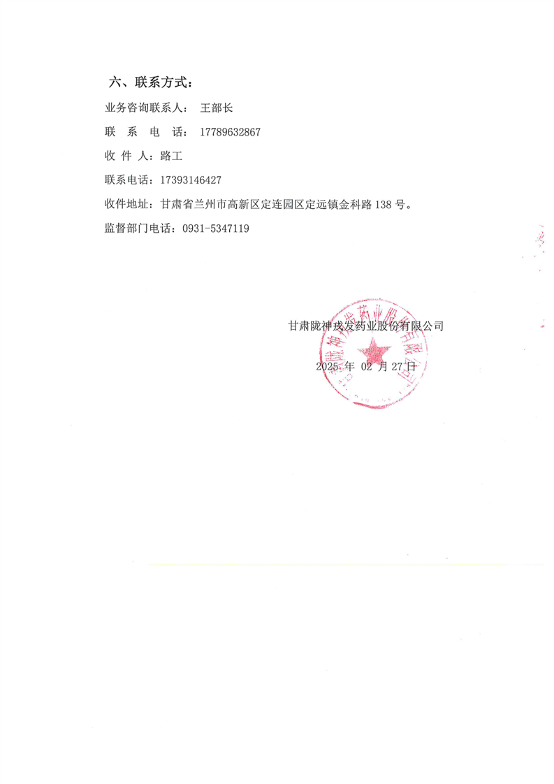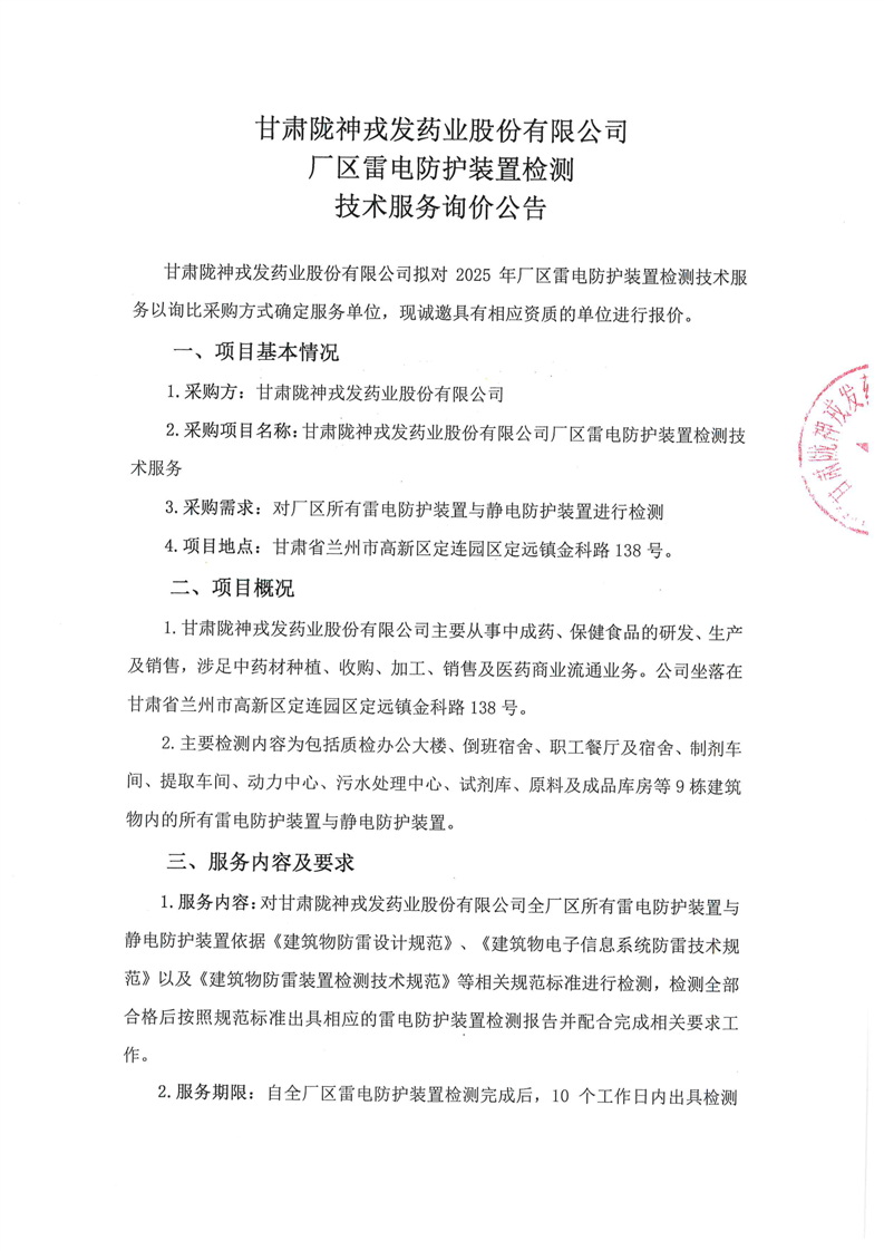 甘肃陇神戎发药业股份有限公司厂区雷电防护装置检测技术服务询价公告
