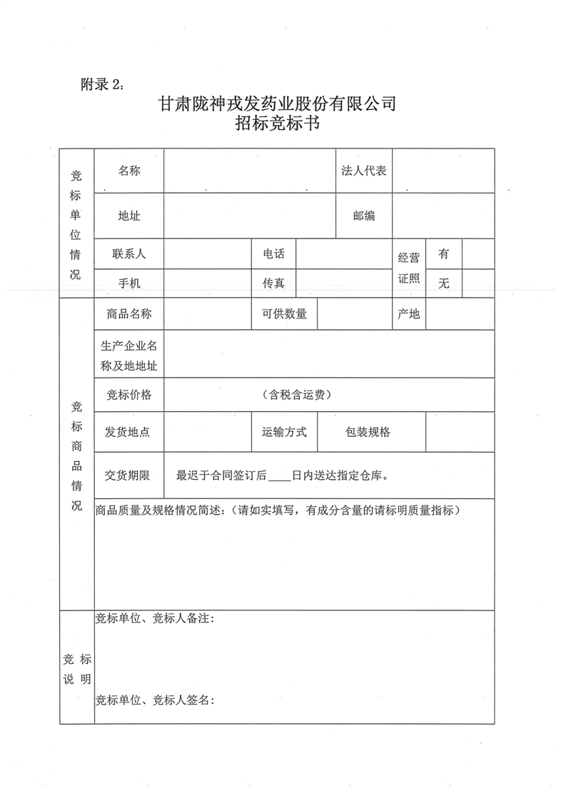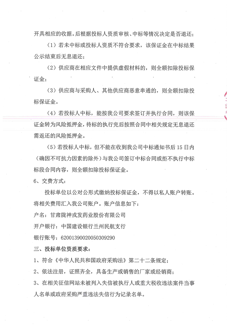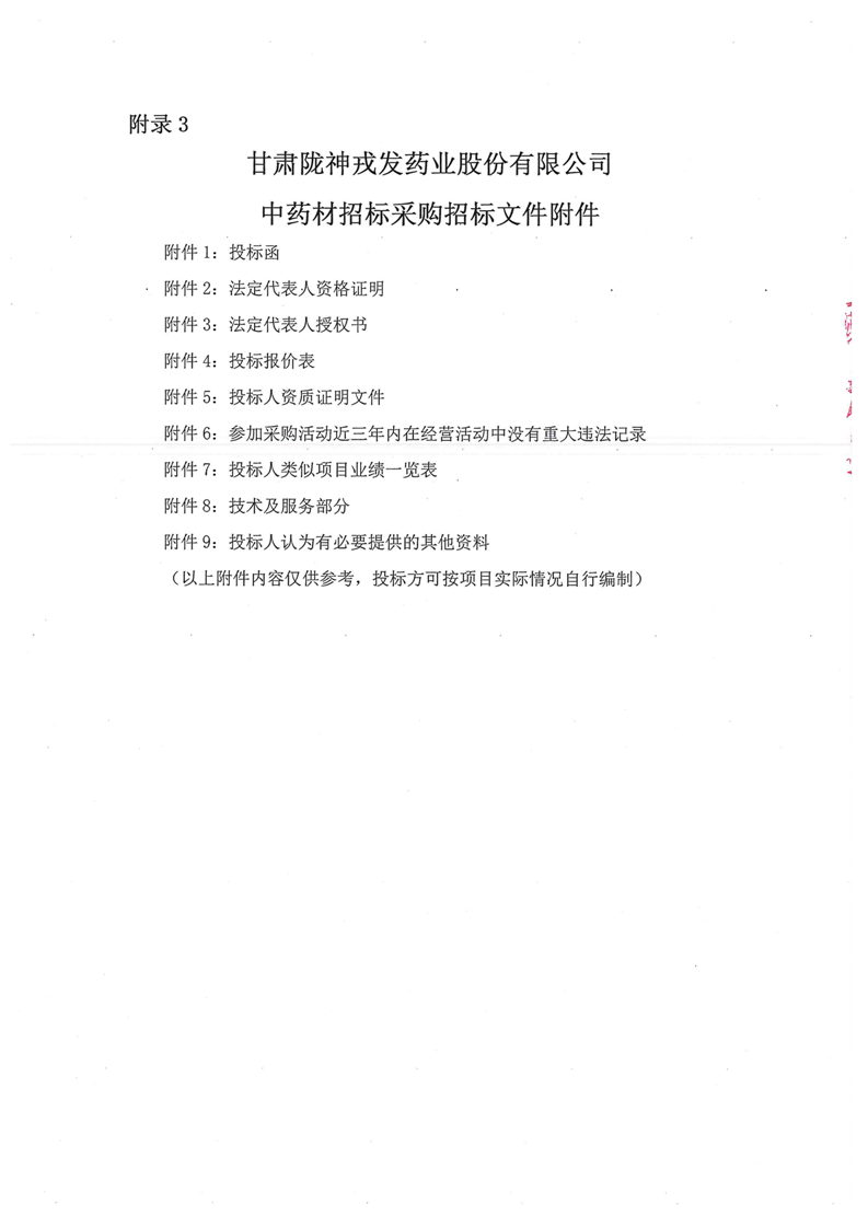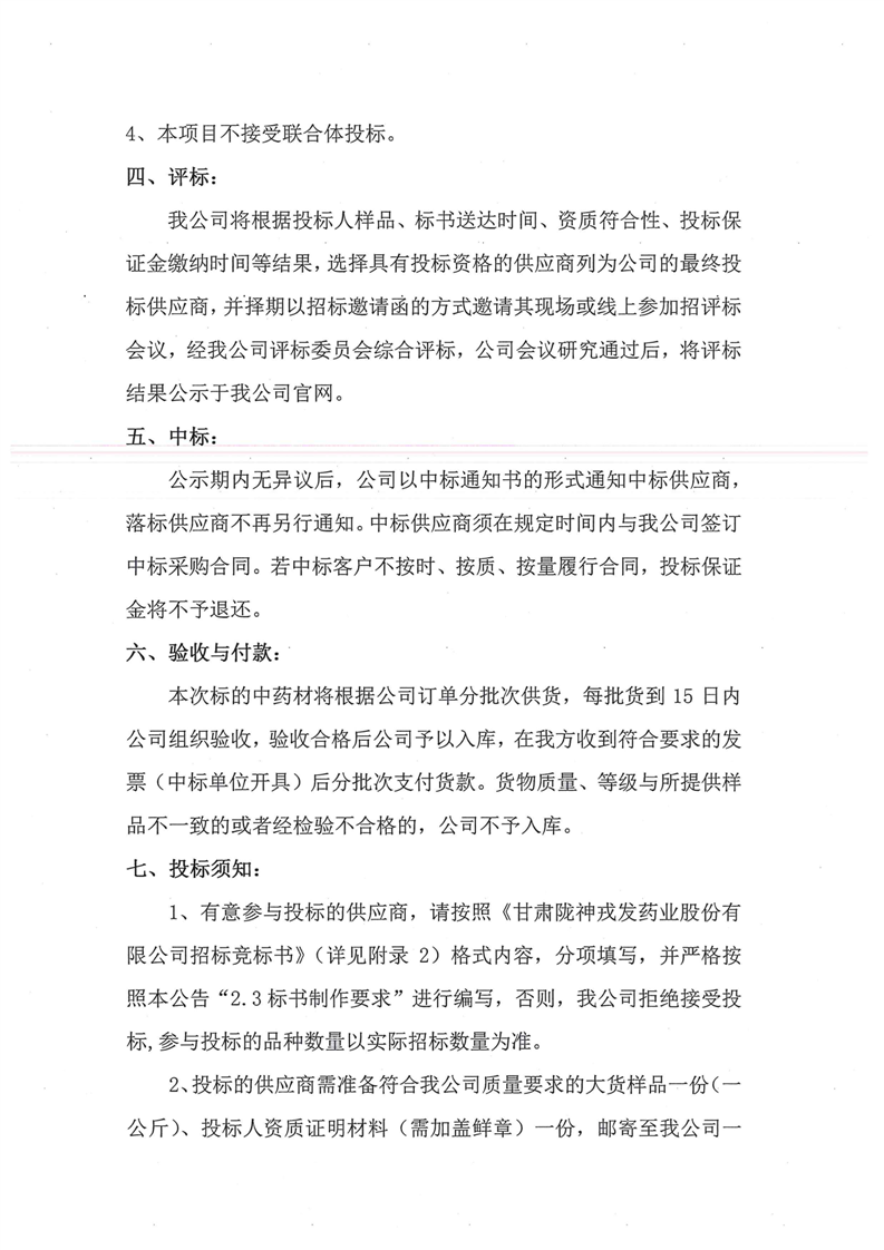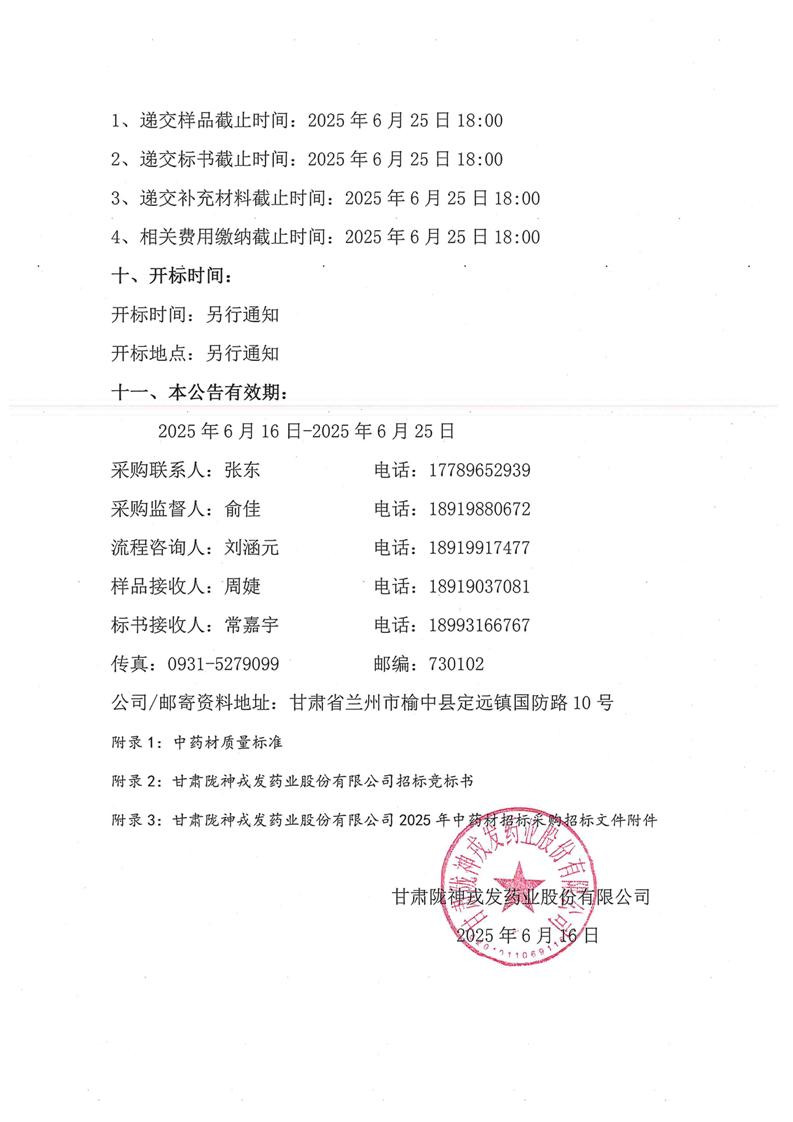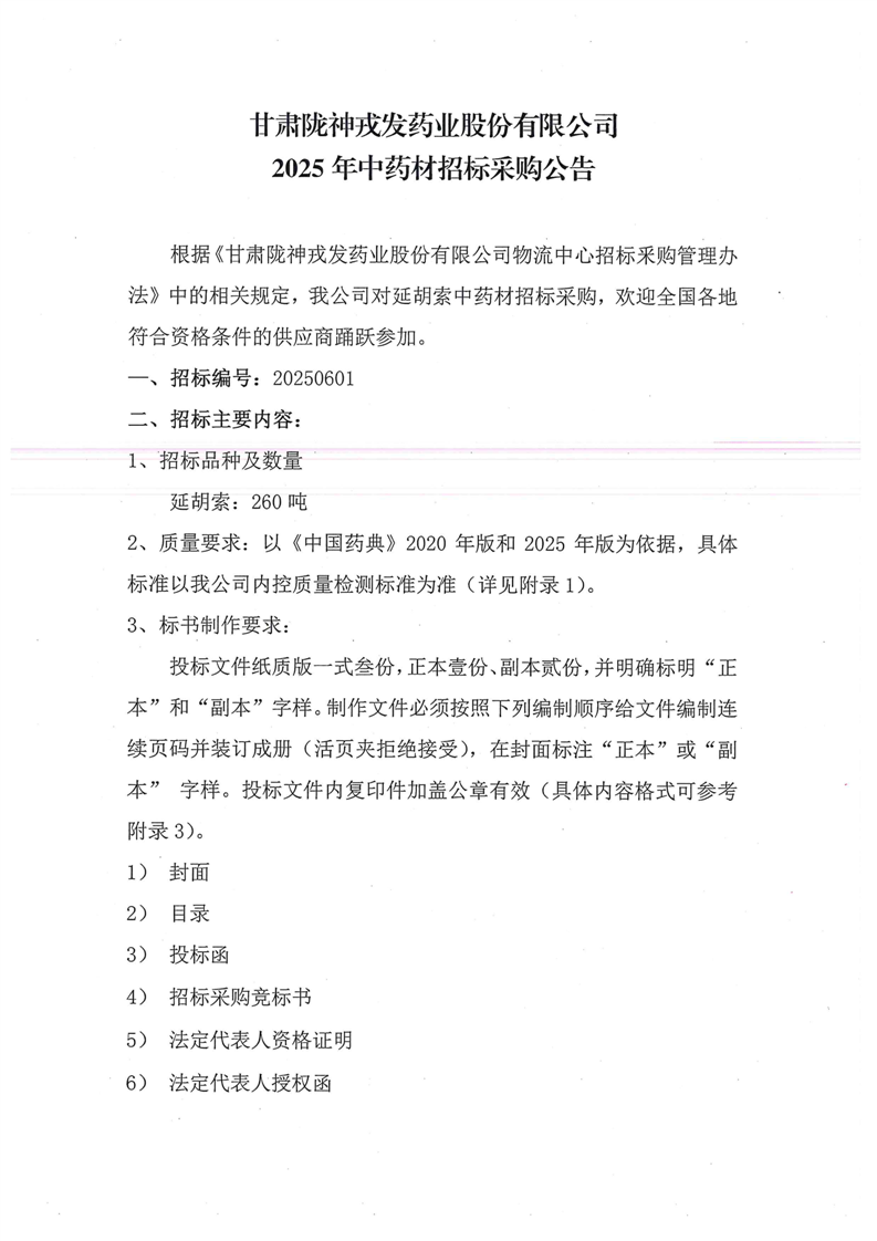 甘肃陇神戎发药业股份有限公司2025年中药材招标采购公告