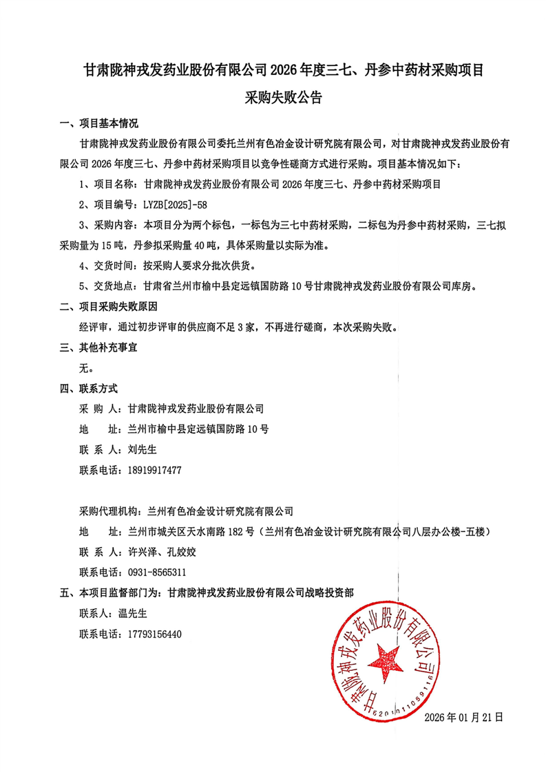 甘肃陇神戎发药业股份有限公司2026年度三七、丹参中药材采购项目采购失败公告