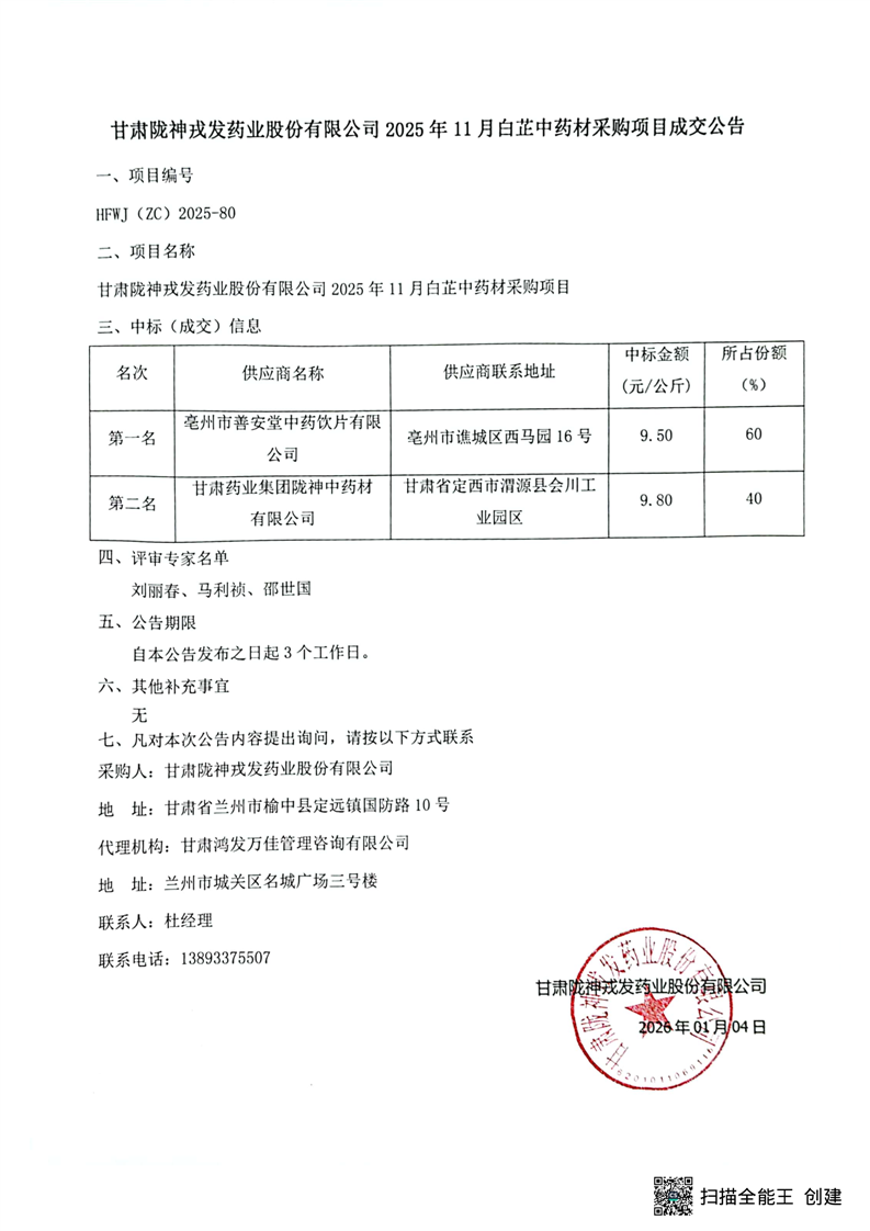甘肃陇神戎发药业股份有限公司2025年11月白芷中药材采购项目成交公告