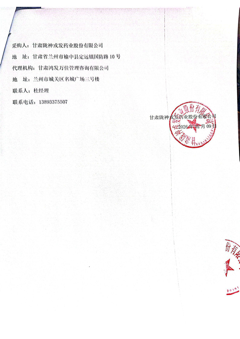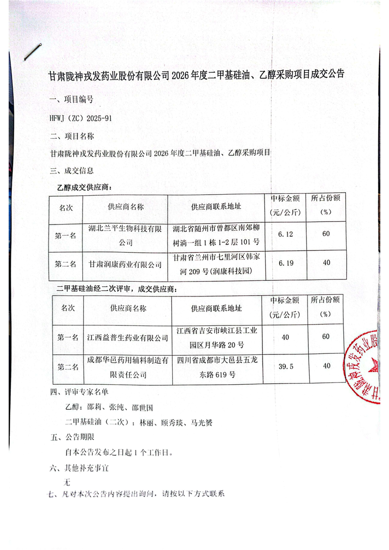 甘肃陇神戎发药业股份有限公司2026年度二甲基硅油、乙醇采购项目成交公告