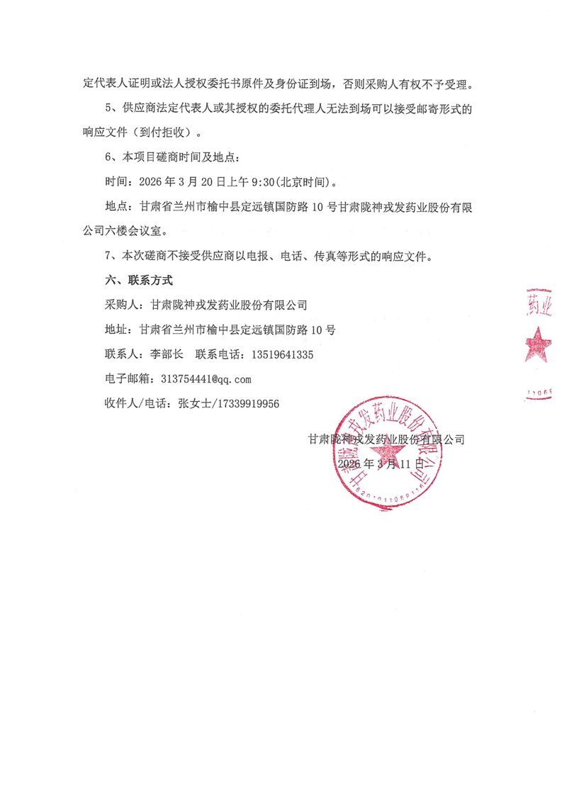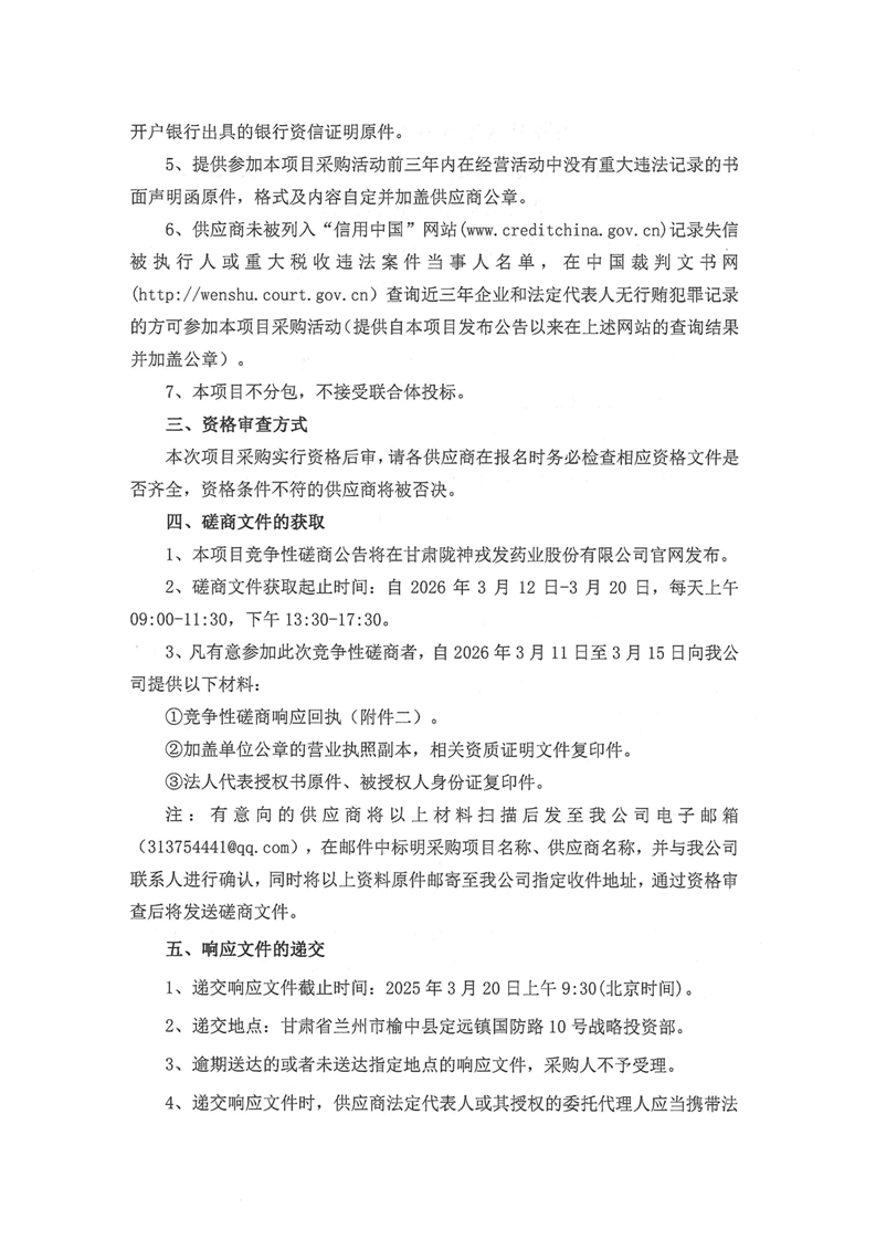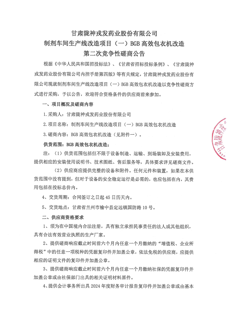 甘肃陇神戎发药业股份有限公司制剂车间生产线改造项目(一)BGB高效包衣机改造第二次竞争性磋商公告