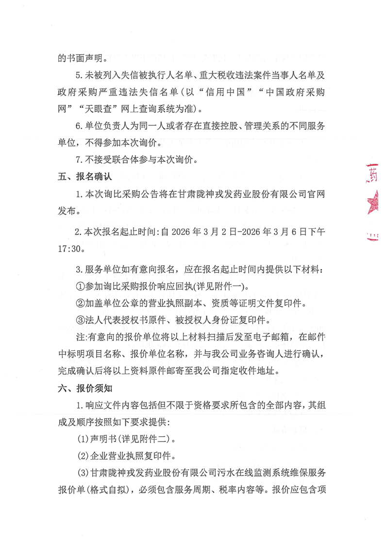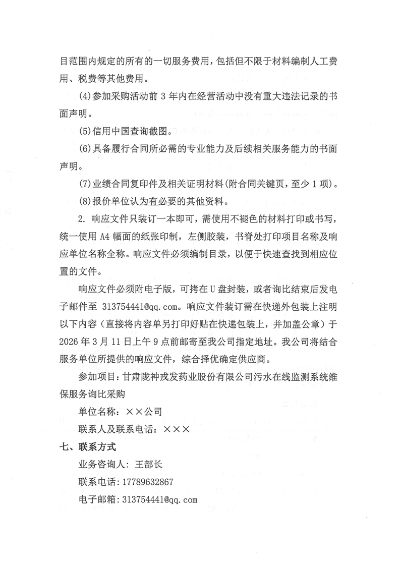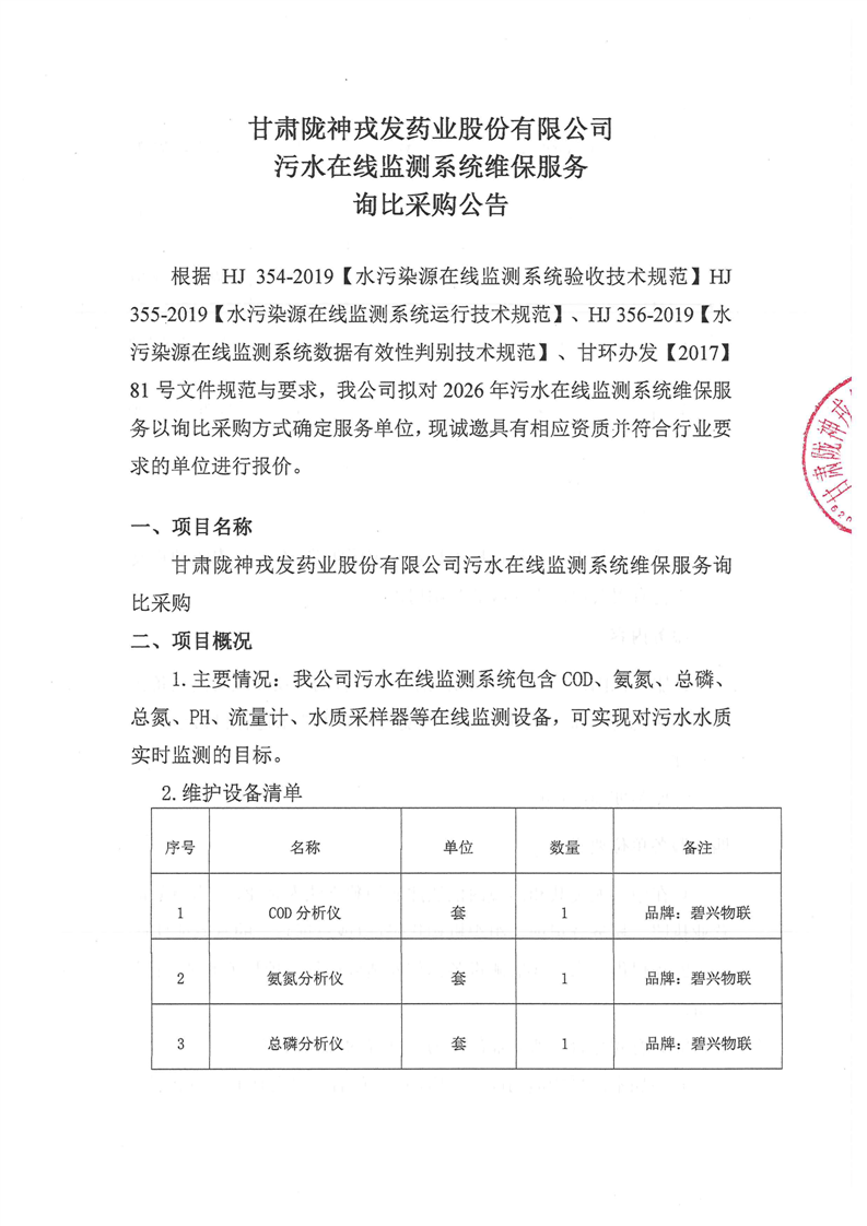 甘肃陇神戎发药业股份有限公司污水在线监测系统维保服务询比采购公告