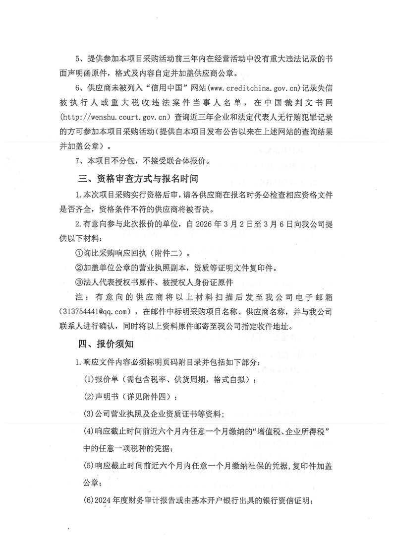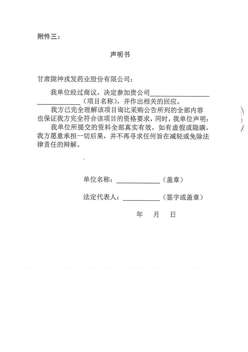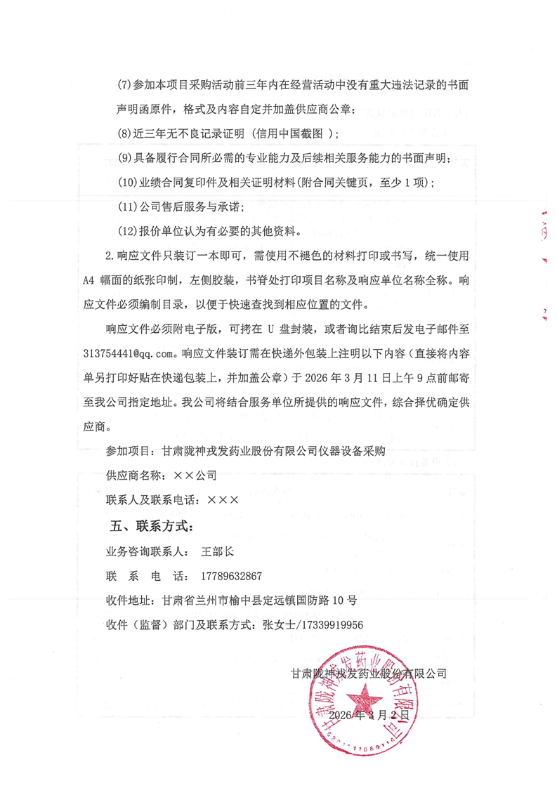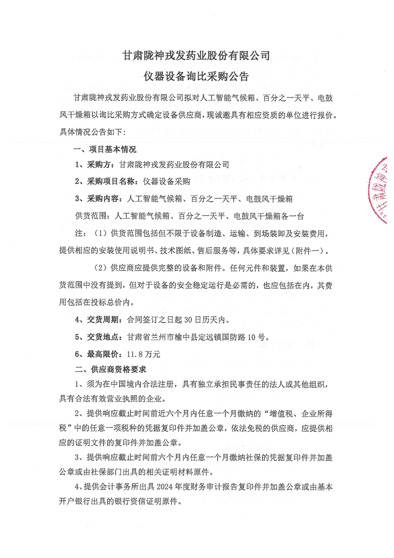 甘肃陇神戎发药业股份有限公司仪器设备询比采购公告