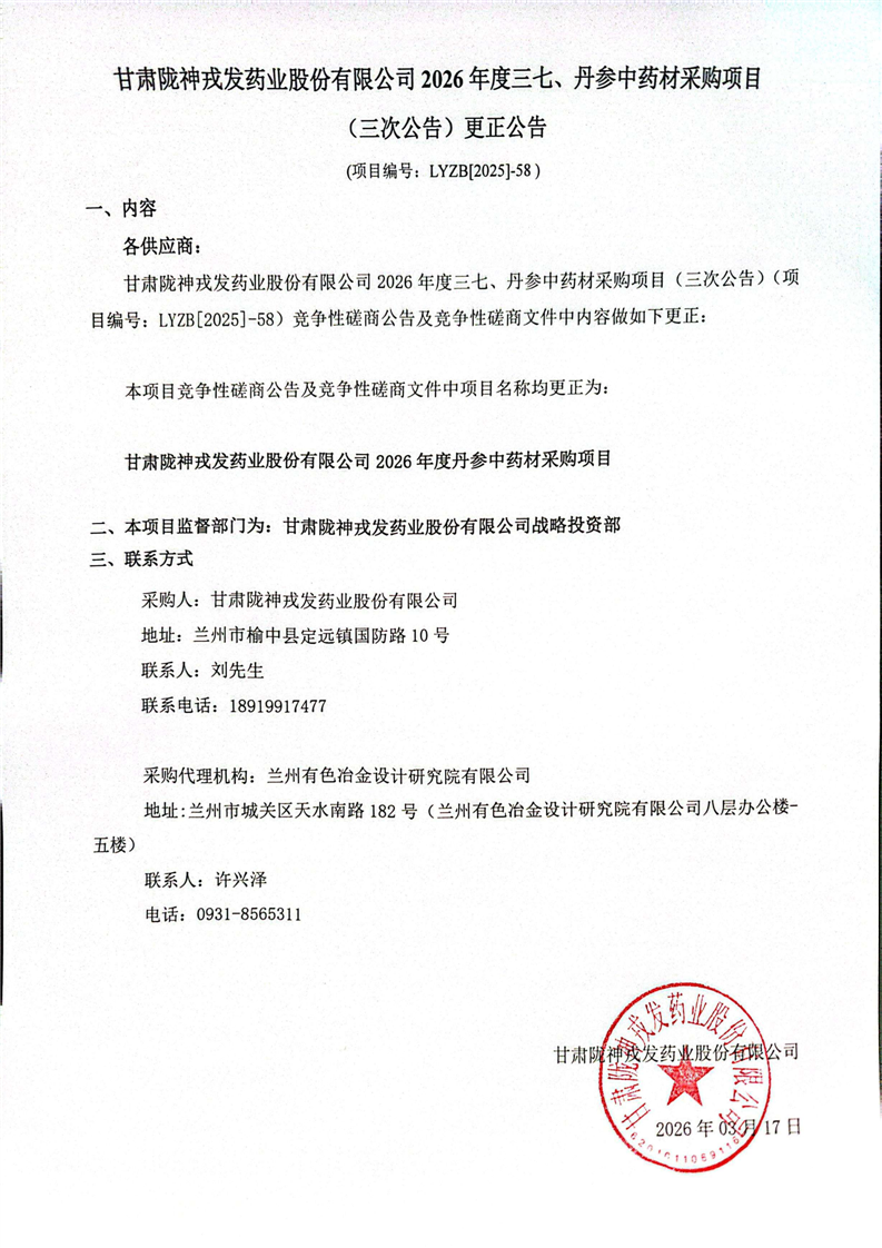 甘肃陇神戎发药业股份有限公司2026年度三七、丹参中药材采购项目(三次公告)更正公告