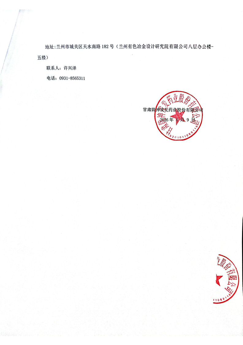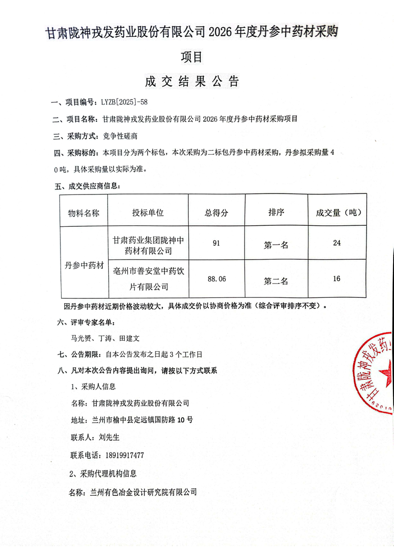 甘肃陇神戎发药业股份有限公司2026年度丹参中药材采购项目成交结果公告
