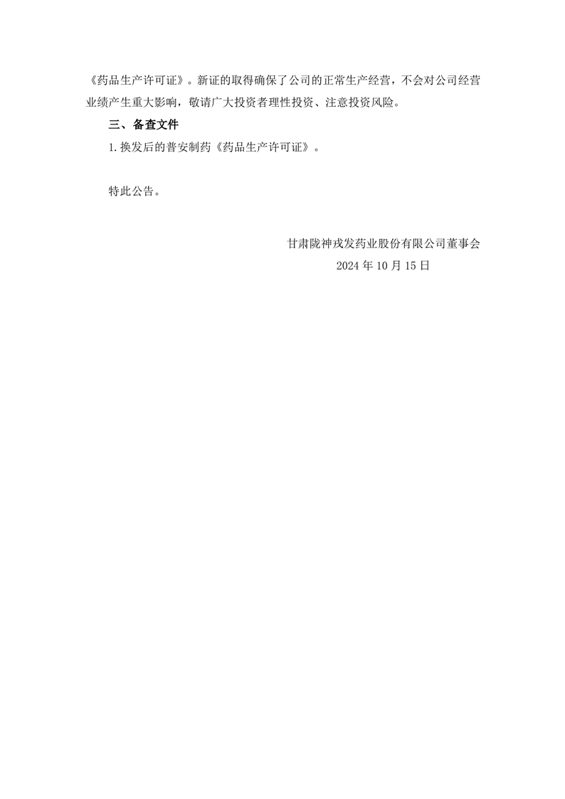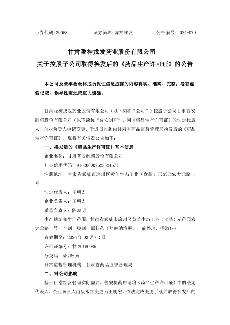 关于控股子公司取得换发后的《药品生产许可证》的公告