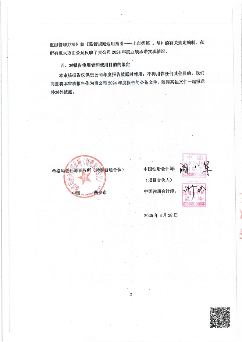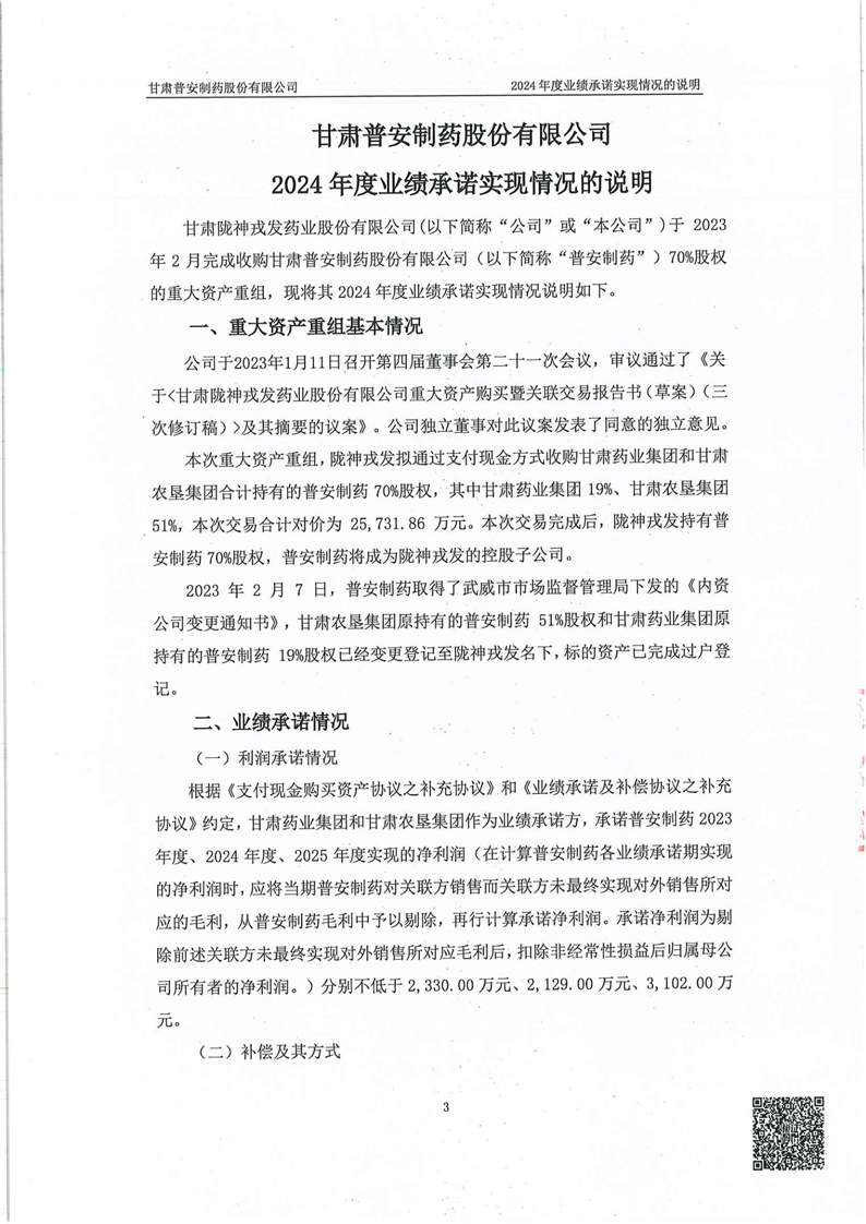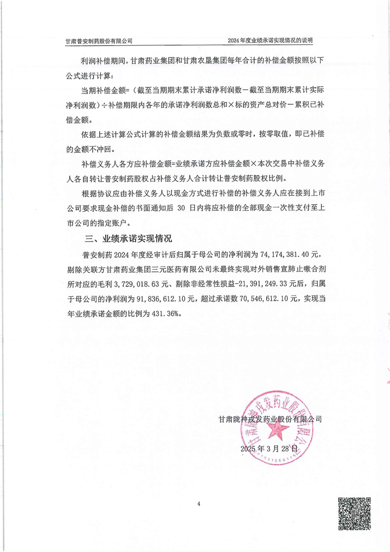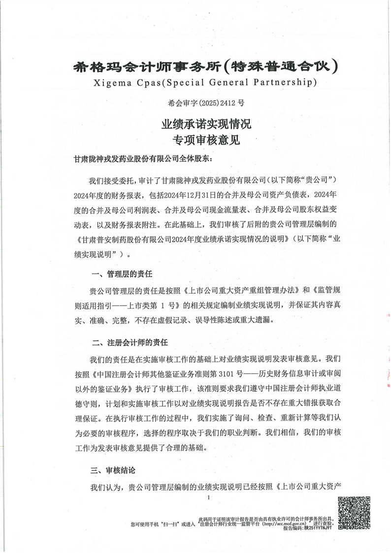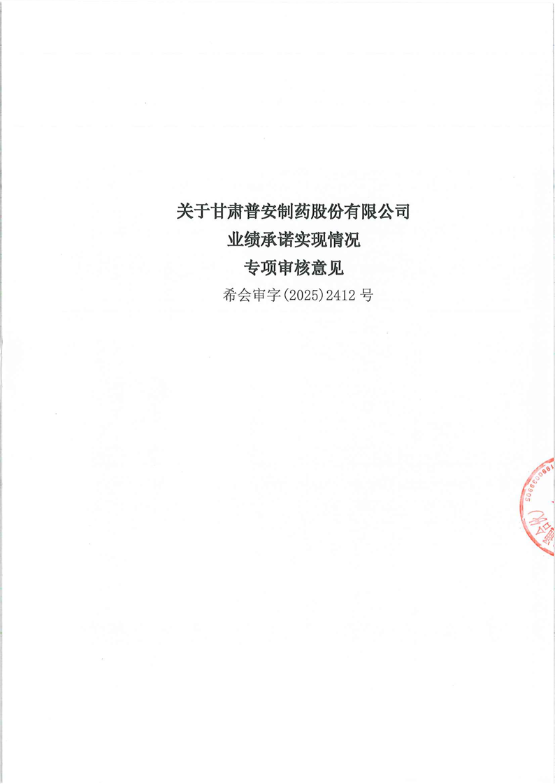 关于甘肃普安制药股份有限公司业绩承诺实现情况专项审核意见
