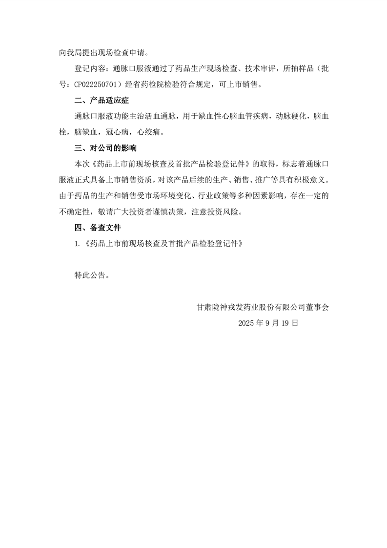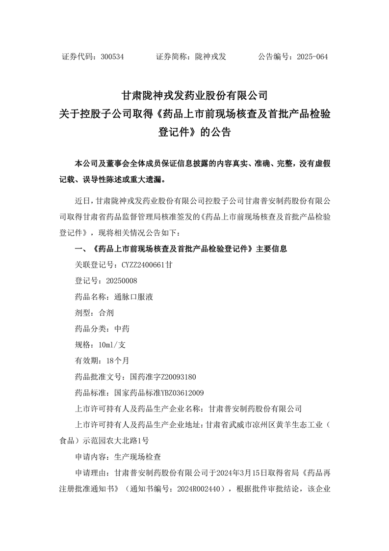 关于控股子公司取得《药品上市前现场核查及首批产品检验登记件》的公告