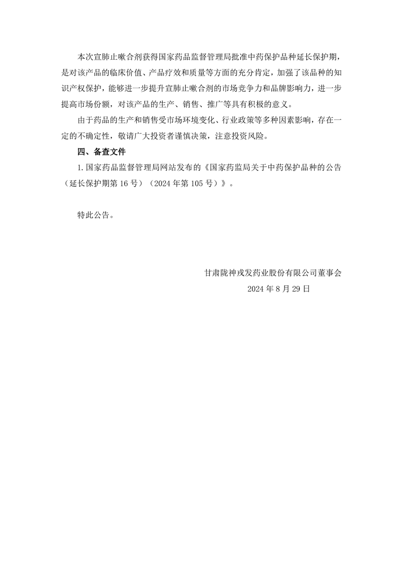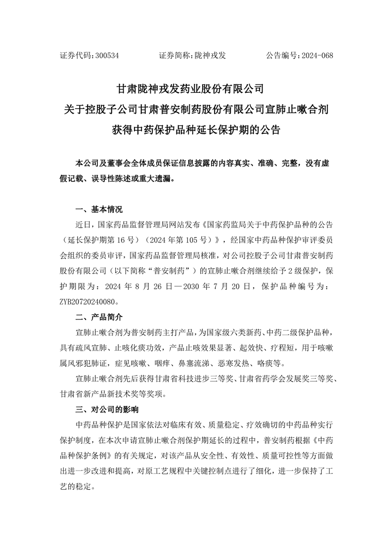 关于控股子公司甘肃普安制药股份有限公司宣肺止嗽合剂获得中药保护品种延长保护期的公告