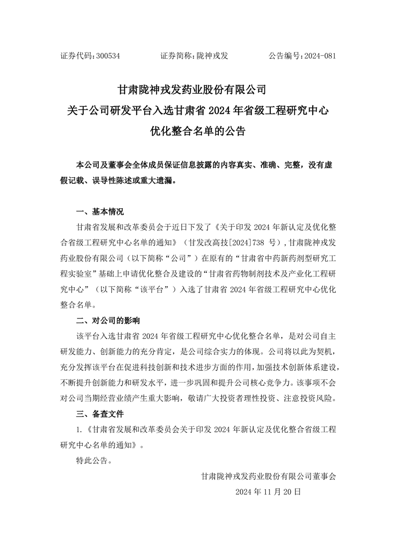 关于公司研发平台入选甘肃省2024年省级工程研究中心优化整合名单的公告