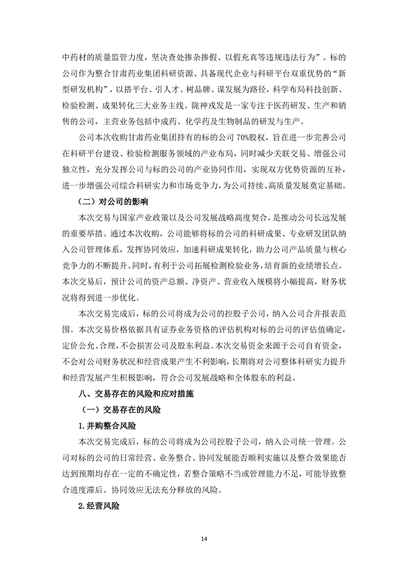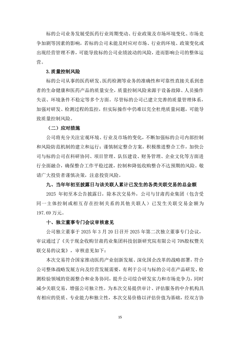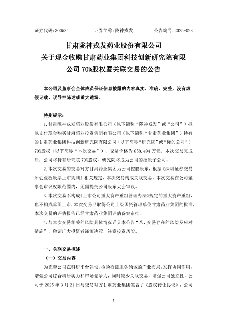 关于现金收购甘肃药业集团科技创新研究院有限公司70%股权暨关联交易的公告