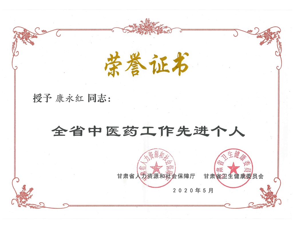 陇神戎发康永红同志荣获“全省中医药工作先进个人”